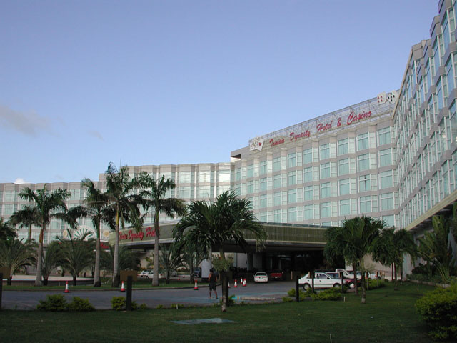 その他のメンバーのうち、私とkonkonさん夫妻はフレミングストアーへ買い物にいくことに。カジノの受付で車の手配を頼みますが、冷たくテニアンにはタクシーがありませんと。ここで私はおもむろに伝家の宝刀プラスチックカードを見せます。あわててフィリピンのカジノホスト登場。すぐにホテルの車を手配してくれました。