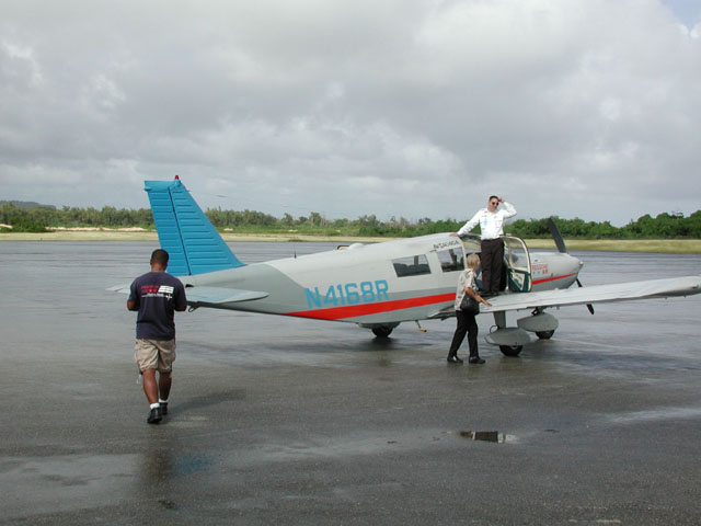 空港では我々以外に3人乗客がいましたので1回では行けません。成田行きの篠塚クンとはここでお別れです。我々はセスナが戻ってくるまで待つことに。そこで空港係員がやってきて突然カタコトの日本語でみんなの体重を聞いてきます。キャロママは大慌てでコソット係員の耳元でつぶやいていました(笑)