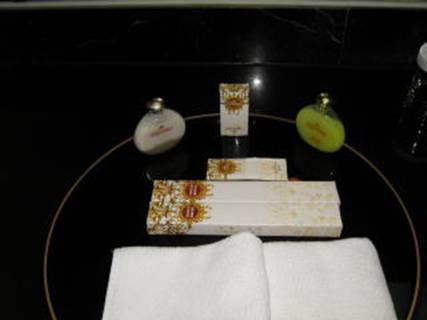 アメニティは貧相。手前からハンドタオル、歯ブラシ、カミソリ。奥左からボディローション、綿棒、シャンプー。浴槽の所にバスバブルがありました