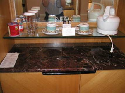 冷蔵庫の上にはお茶セットあり。左のスナック類は有料ですが、真ん中のインスタントコーヒーはサービス。(一度も飲まなかったけど)
