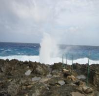 解説 不思議な自然現象で天候と波により石灰石の石棚の下で 洞窟が出来,波が洞窟にぶつかる時に上方から潮を吹き上げる.