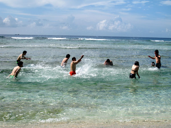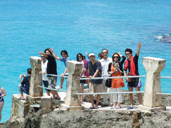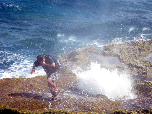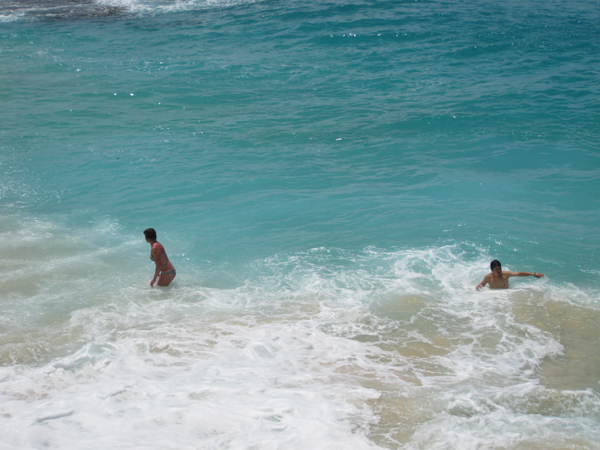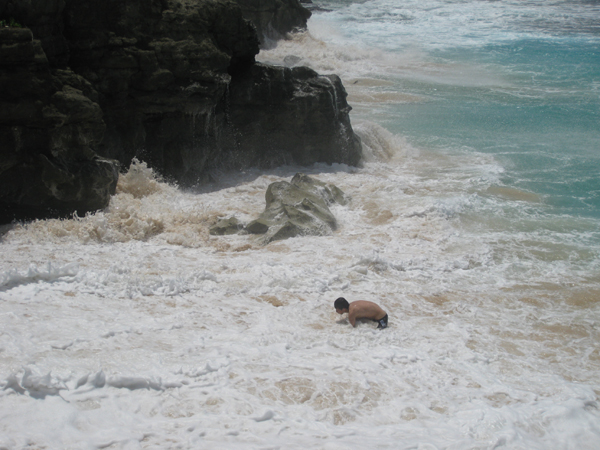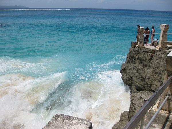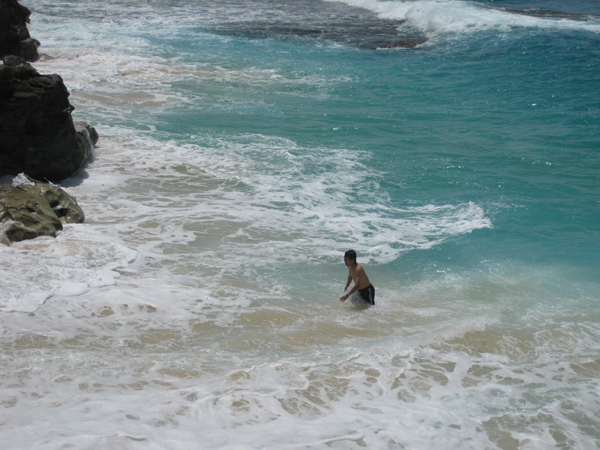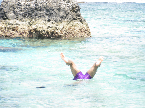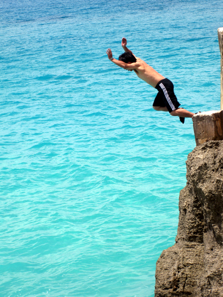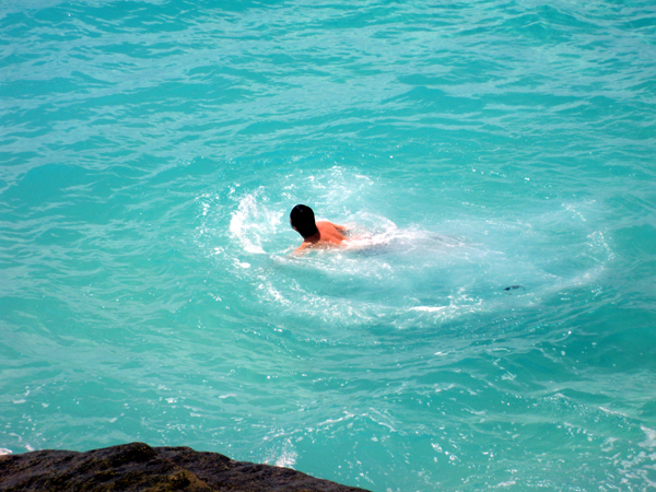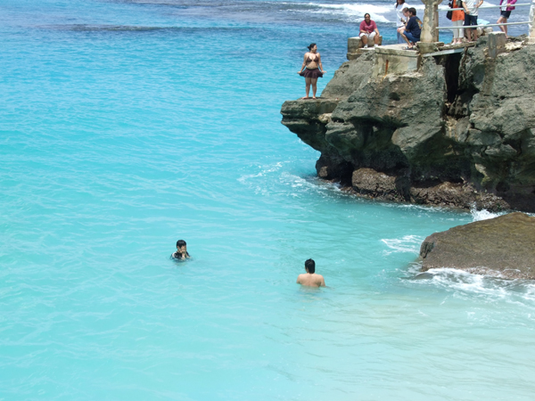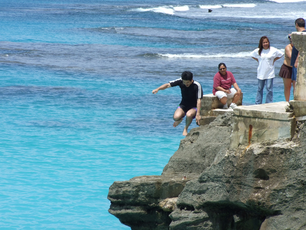 ここではやはり、恒例の飛び込みをしなければなりません。高さ約5メートルの岩場から地元の子どもたちがワイワイ言いながら楽しく飛び込んでいます。穏やかな波が打ち寄せて、ちょうど飛び込みにはちょうどいいコンディション。
