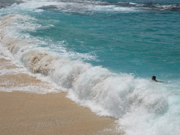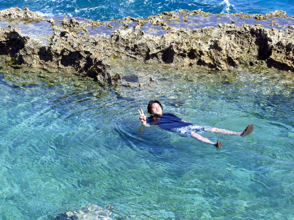 島の西側に出ると「チュルビーチ」です。ここはアメリカ軍が最初に上陸してきた場所。遠浅で波が穏やかです。みんな海を見つめているうちにまたひとりひとり泳ぎはじめます。海が怖くなっていたカジ郎も泳ぎだしました。(でも、波が来るたびビビッていました。小さい波なのに・・・)