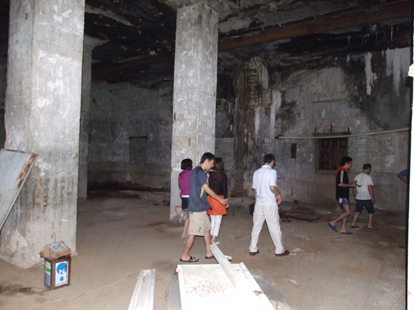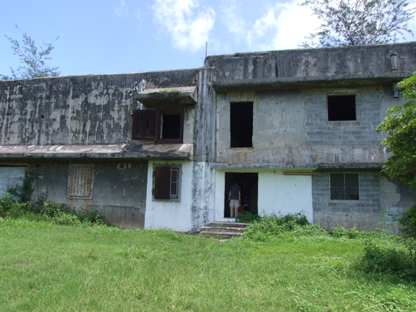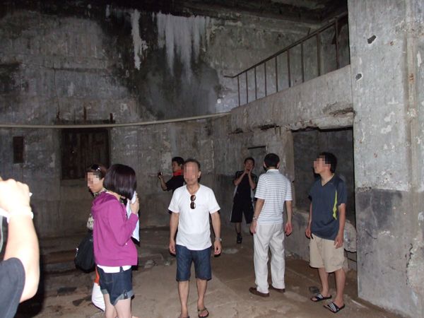 「旧日本軍通信基地」に到着。壁にはいたるところに弾痕があります。不気味な幽霊屋敷のような建物です。戦後は牛の屠殺場として使われていたらしいので、人と牛の亡霊がうようよ出てきそうです。しかし、ここまで来たら入らないわけには行きません。みんな恐る恐る突入・・・・・。昼間だったので結局なにもなかったのですが、「きもだめし」とては面白いアトラクションでした。
