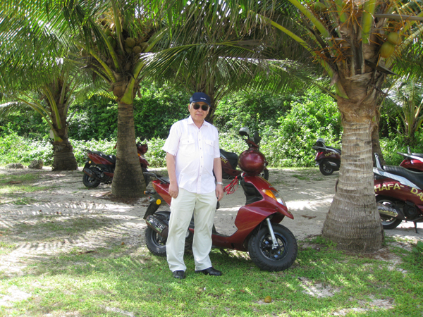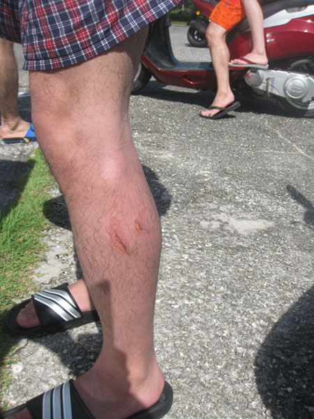 さあ、出発です。スクーターを発信するには、海に背を向ける体制つまり180度回転させる必要があります。ただし、スクーターの前輪の先には車止めがあるので、スクーターを少しバックさせてハンドルを回して方向転換させるのですが・・・・・