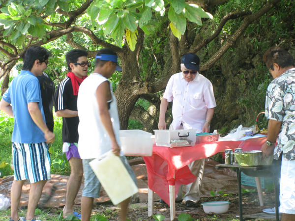 ビーフ、ポークチョップ、チキン、ソーセージ、えび、いか・・・そしてそしてキンキンに冷えたビールまで。しかもシェフはテニアンの日本料理「Island Garden Reasaurant」の日本人オーナー。給仕をお手伝いしてくれる現地のスタッフまでも。