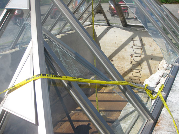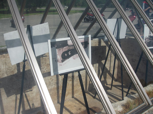 次は、ハゴイ空軍基地の隅にある原爆搭載機発進記念碑です。1945年8月、ここで原子爆弾「リトルボーイ」がB-29エノラゲイに搭載された場所です。我々が行ったときには、ガピットを覆ったガラスが一部破損しておりました。原因が人為的なのが自然災害なのかはわかりません。