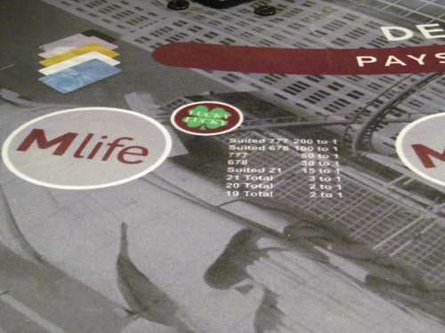 さらに、「Double Attack BJ」という卓がありました。プレイを少し見ていたのですが、見ている間には誰も「Attack」のbetをしなかったのでよくわからないままでした。でも、興味深かったのは、普通はゲームの1枚目はファーストベースに配るのですが、ここでは親のところに配ってました。それも表向け。次がファーストベース~サードベース。その次は親のカードで、先の表向けたカードの下に伏せた状態で差し入れました。そしてファースト~サードに配ります。ふうん???
