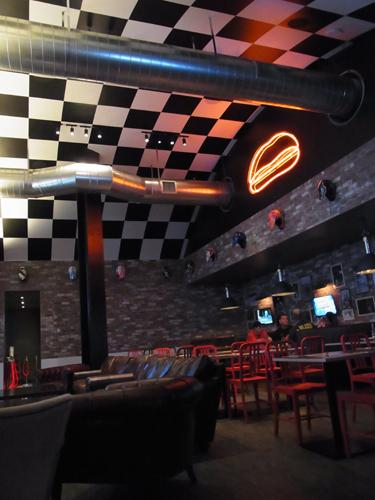 写真左奥のカウンターは、スポーツブックのカウンターです。店内には大きなモニターでいろんな場面を流しています。バーガーと関係ない人も、中央の席や簡単な席には自由にすわれるみたいです。壁際のちゃんとした席は、バーガー屋専用ってことかな、テーブルセッティングしてあるしね。