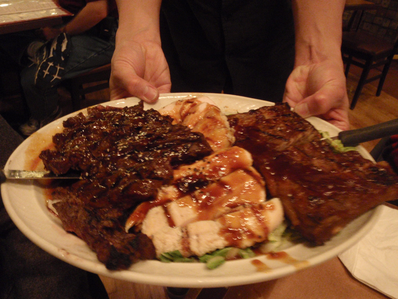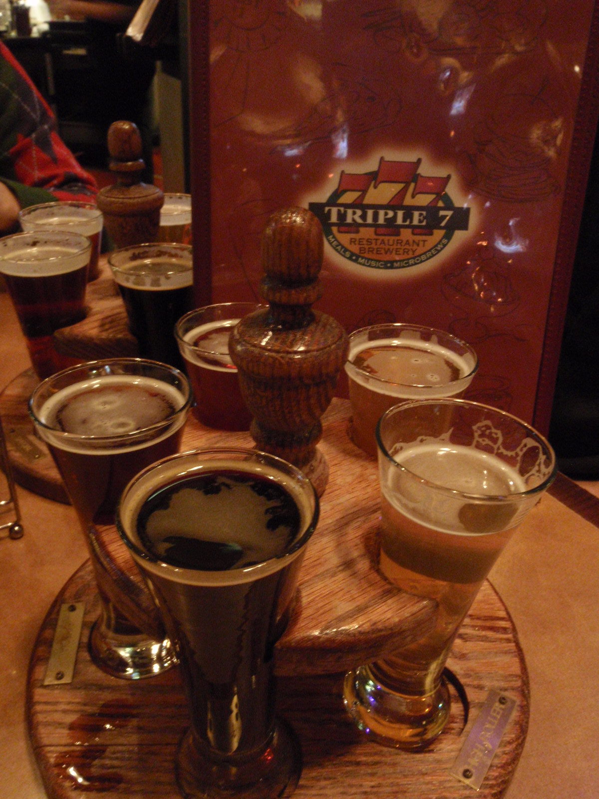 3時間ほどハシゴし、ややマイナス。夕食は「Main Street Station」内のビアレストラン「777(トリプルセブン)」。古き良き時代の雰囲気を残す地ビールの店です。アメリカのビールは水っぽいものが多いのですが、この店のビールはどれもコクがあって美味。「Sampler」なるお試しセットを頼むと、5種類のビールをすべて味わうことができます。「お試し」といっても結構な量なので、日本人ならこれだけで十分かも。欧米人は「お試し」の後改めて好みのビールを注文しています。