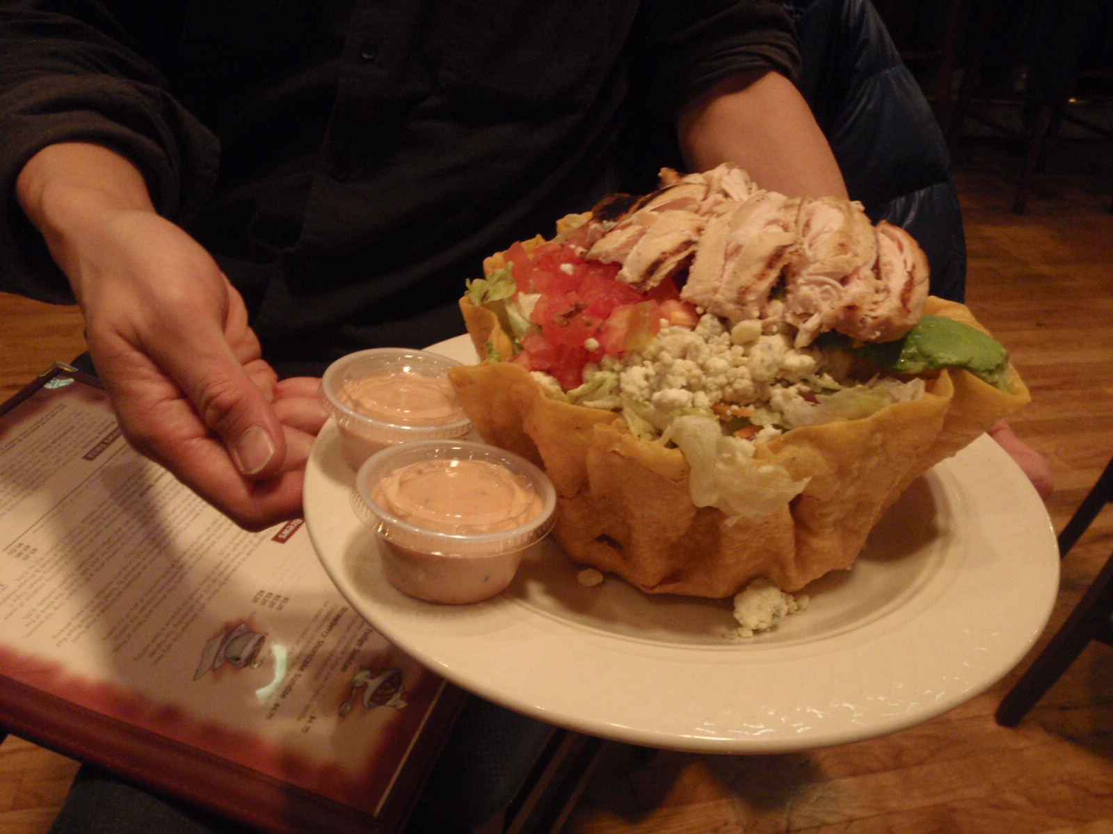 ツマミは「Chicken tender platter」と「Cobb Salad」。ウェイトレスは「4人でこれだけで大丈夫か?」と心配してましたが、予想通りドカ盛り。とても食べきれず、残りはお持ち帰りにしました。