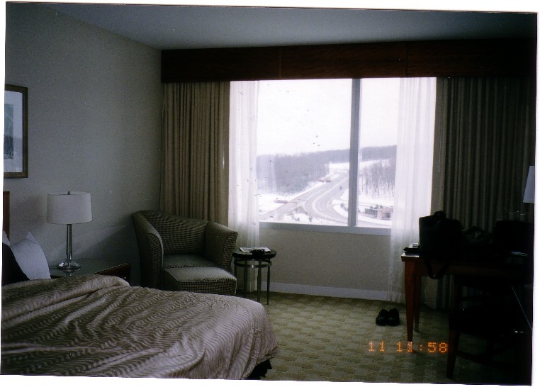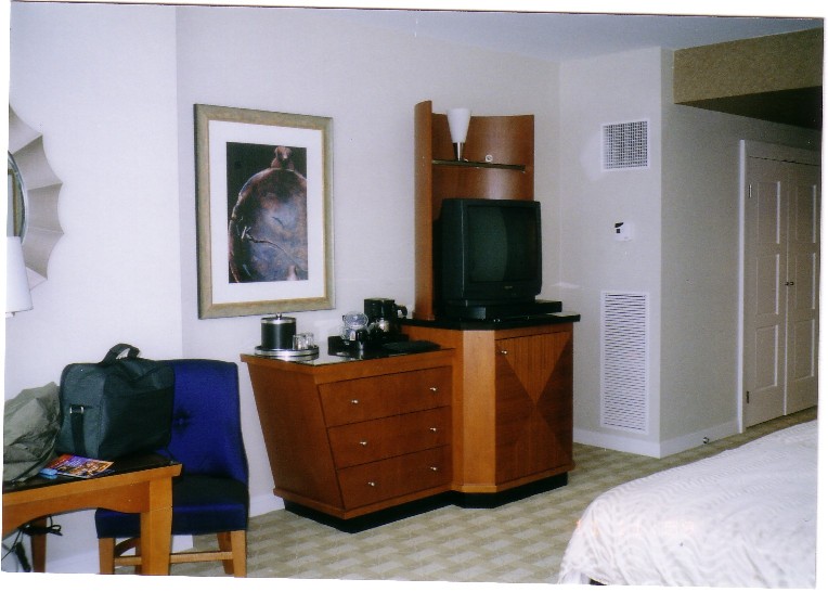 部屋は南向きで左手には川が望める。部屋の設備や備品はベガスと比べると充実。ベガス以外のシティホテルなみ。まあまあの広さですっきりした印象、窓は大きめ、アメニティーは充実、タオルも多い。コーヒーメーカー、空の冷蔵庫、金庫付き。テレビは、最近アメリカのあちこちのホテルで導入されている、ビデオオンデマンドやネット接続のできるタイプ。個人的にはオットマンがあるのがポイント高し。