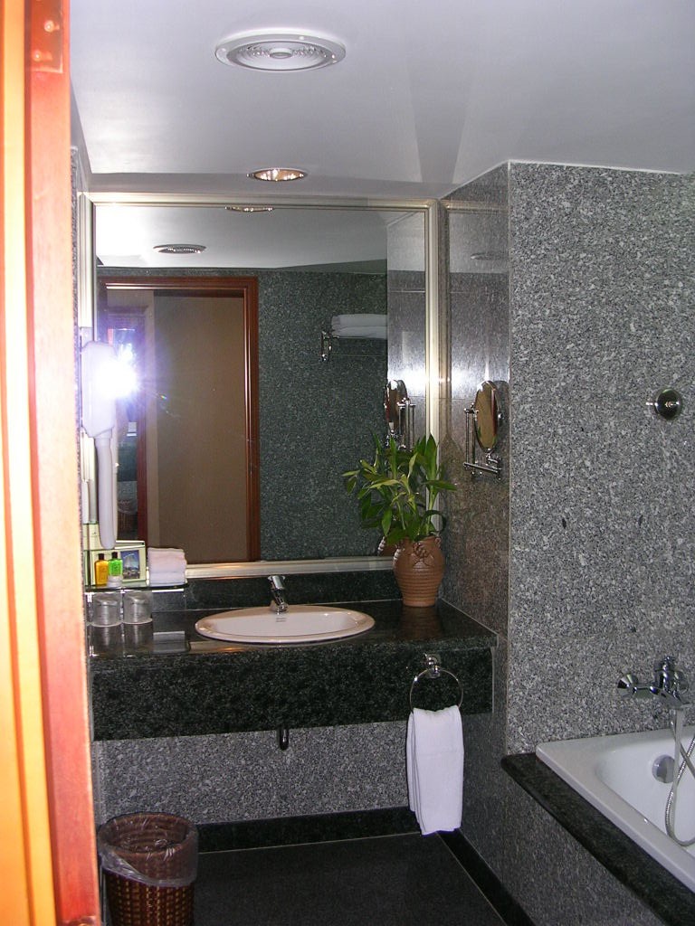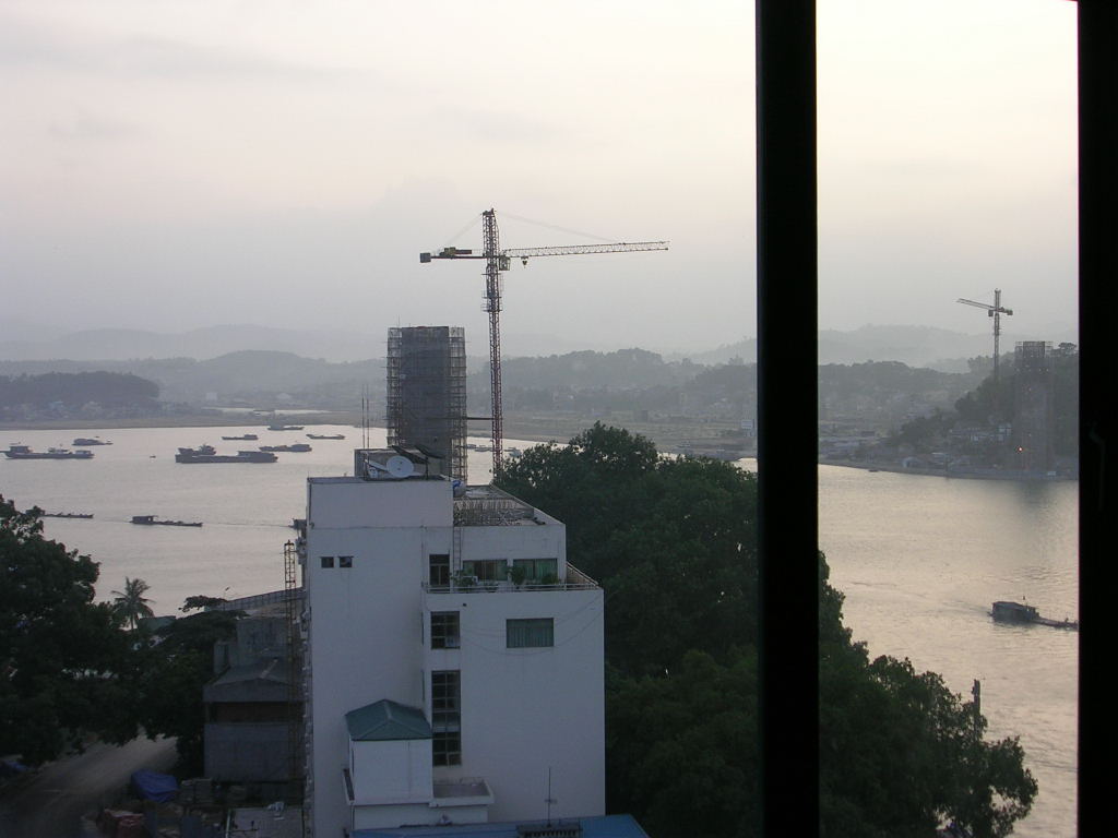 あと私が泊まったホテルはハロンプラザホテルで4つ星でした。部屋代はツアー料金の含まれていてはっきりしないのですが、香港で予約をとろうとしたときはHK$610(8,540円相当)との事でした。私がいた時は見かけませんでしたが、ガイドブックによると客の60%が日本人で、1階にはフォーシーズンというベトナムから始まって中華、西洋、日本料理を食べれるレストランがあります。後から考えるとガイドさんが嫌がってもここで食事しとけばよかった。客室の中ももちろん何も問題がなく寝るだけの私にはもったいないくらいでした。部屋はSEAVIEWで今建設中のホンガイへわたる橋が完成すれば、ちょうど部屋の真正面に見えることになります。写真の窓の外に見える2つのクレーンが建設中の橋です。(清水建設が請け負っているそうです。)LANのソケットらしき物があったので部屋でもネットはできそうです。私はビジネスセンターへ行って書き込みをしていました。ちゃんと日本語を入力できるようパソコン設定しておいたので行った時にはご利用ください。