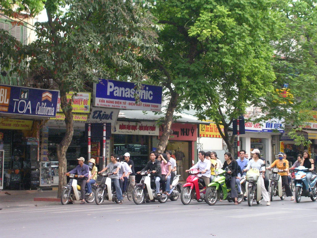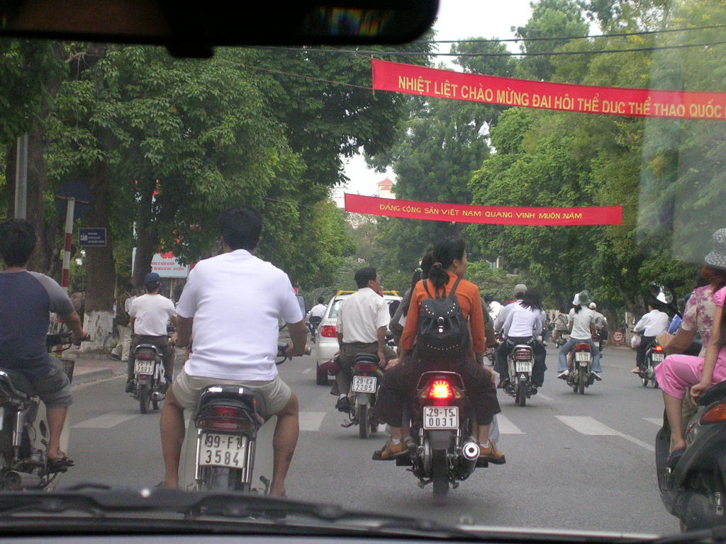ハノイの町は街中にいくつも湖がある自然に恵まれた町です。ベトナムもドイモイ政策のもと、経済発展を続けていると聞いていたのでさぞや活気に満ちた町と思っていたのですが、活気がないわけではないのですがどちらかというと静かで落ち着いた感じを受けたのは、私の気のせいでしょうか。(1時間ちょっとの滞在で判断はできませんが)。あとハノイで一番印象が強かったのがバイクの多さです。とにかく道をいくのは殆どすべてバイクです。ガイドさんに聞くとこの日は日曜日でまだましなほうだそうです。平日の朝夕のラッシュ時はほんとにバイクの波がすごいそうです。聞くと国内生産の韓国製の軽4と同じくらいの大きさの車が約1万US$するそうですからまだまだ高値の花なのかもしれません。(中国より高い)
