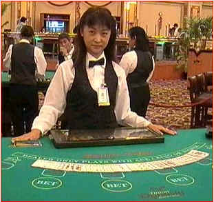 また、カジノマニア向け解説をば。(ディーラー情報)ここのカジノは圧倒的に女性ディーラーが多い。(5対1位)カジノ猿はディーラーと話をしながらプレイするのがスタイルなので、必ず国籍は聞いていることになる。中国人とフィリピン人と、なぜかネパール人が3分の1づつ。慣れてくると顔を見ただけで「Are you Nepali?」などと言えるようになる。中国系は美人多し。SALLY、DORAなどは本当に綺麗。笑うとまたカワイイ。が、なめちゃあいけない。中国人だけじゃなく、どいつもこいつも引きが強い。波にのると3回連続BJなんて平気で出して、澄ました顔してやがる。おばちゃんディーラー(少数だがいる)が相手なら「ウッキー!ざけんな!ワシはやめる!」となるのだが、「Sorry,sir」などと微笑まれるとね(←ただのスケベオヤジ猿じゃん)全体的には、カードを配る手つきも覚束ないようなレベル。すり替えなどは出来そうもない。(と、思わせる作戦の可能性もあり)個人的には愛嬌のある顔の、フィリピン系ディーラーとプレイするのが好きなのでした。片言の日本語を話せる女性(V嬢)がいて、三日目に日本人二人連れと一緒にプレイしている最中、「どうせ日本語わかんないんだから悪口言ってもいいよね」等と言ってたら、「キコエテルヨ」と、すげー高度な日本語のつぶやきが…。彼女とはよくぶつかりました(夜番なのでしょう)