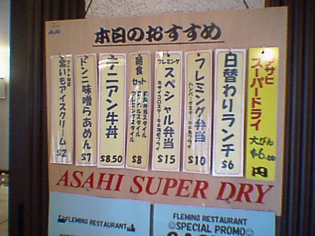 ホテルのベルデスクに頼んで電話して迎えに来てもらう。とっても暇らしい、テロの影響もあるのか?。10分でお迎えに来てくれた。牧草だけを喰んで育ったテニアン牛の牛丼がお勧め。狂牛病の心配なし(ドライバーのXXさん談、本当?)。テニアン牛丼を昼飯に頂いた。道路のまわりには、北マリアナ連邦11月4日の投票日に向けてあちらこちらに選挙の看板。ドライバーの××さんは4年前の選挙の時に来て今回の選挙が終わる頃に日本に帰れると喜んでいる。この話しを聞いてるオイラも不思議と嬉しくなる。Mr.××、ひょっとしてテニアン嫌なのか?。売店で亀田製菓の「鬼太鼓たまり」と産地不明のピーナッツ無しの「柿の種」を購入。