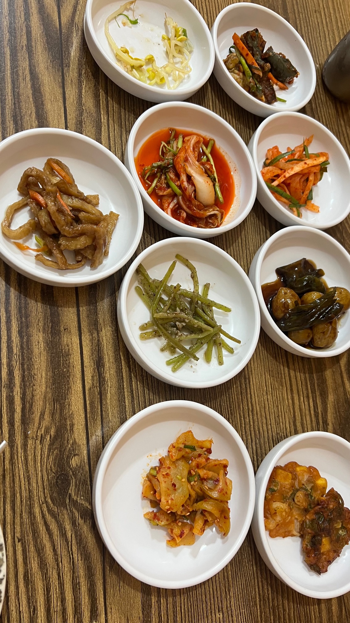 まずパンチャン(無料のおかず)が9皿出てきます。私の好きなのはキムチを始め、おでんと味付きのもやし。小さい芋の味付け。おかわりしながらビールが進みます。