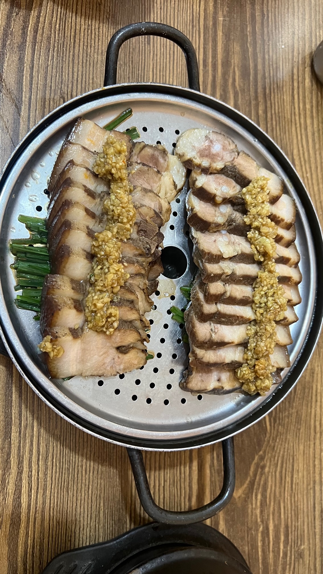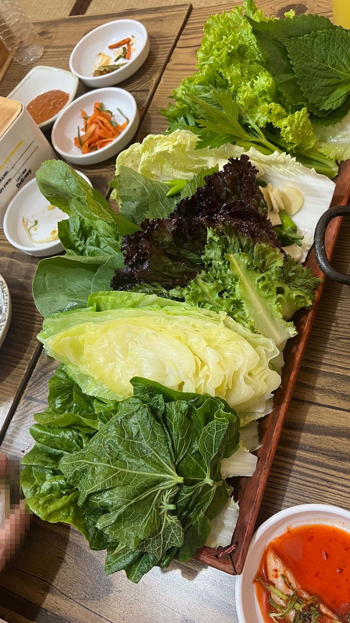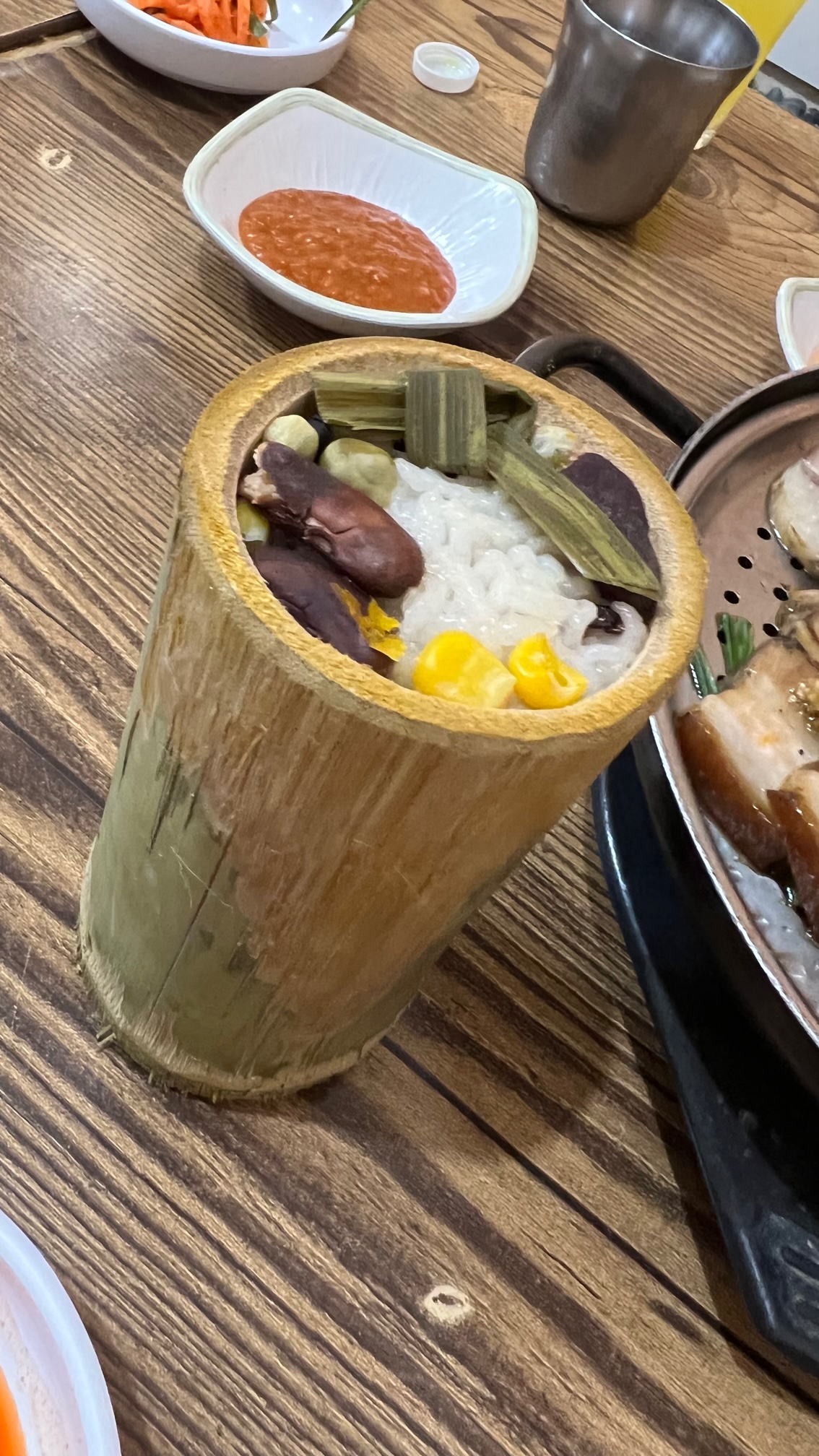 メインのポッサムはやわらかくて美味しい。これに味噌をつけてニンニクとともに野菜でくるんで食べます。野菜もエゴマの葉を始めサンチュ、あと分かりませんが残すぐらいの量が出てきます。竹に包んで大豆と一緒に入ったご飯が出てきます。スンドゥブもプゴクッも満足。