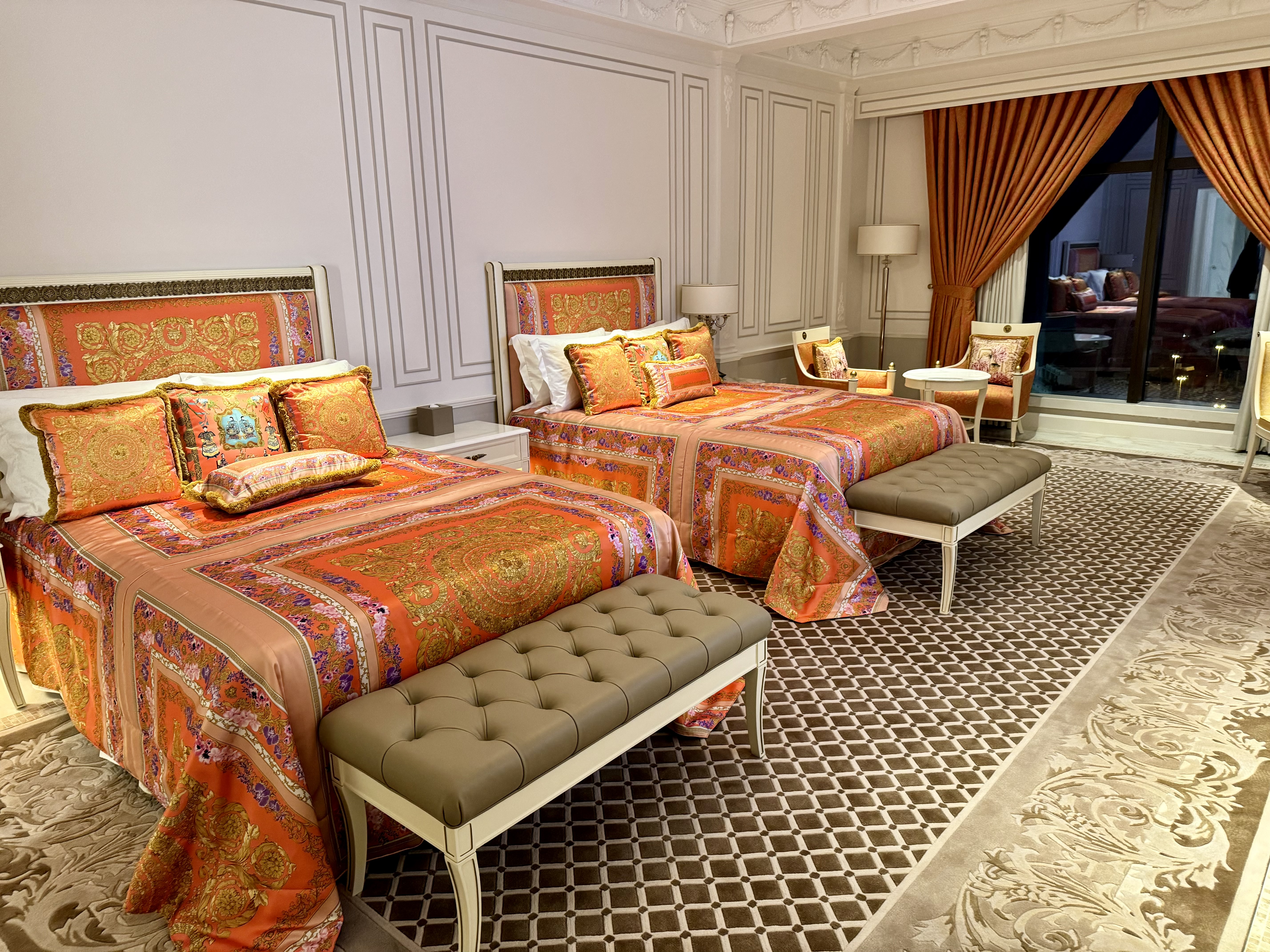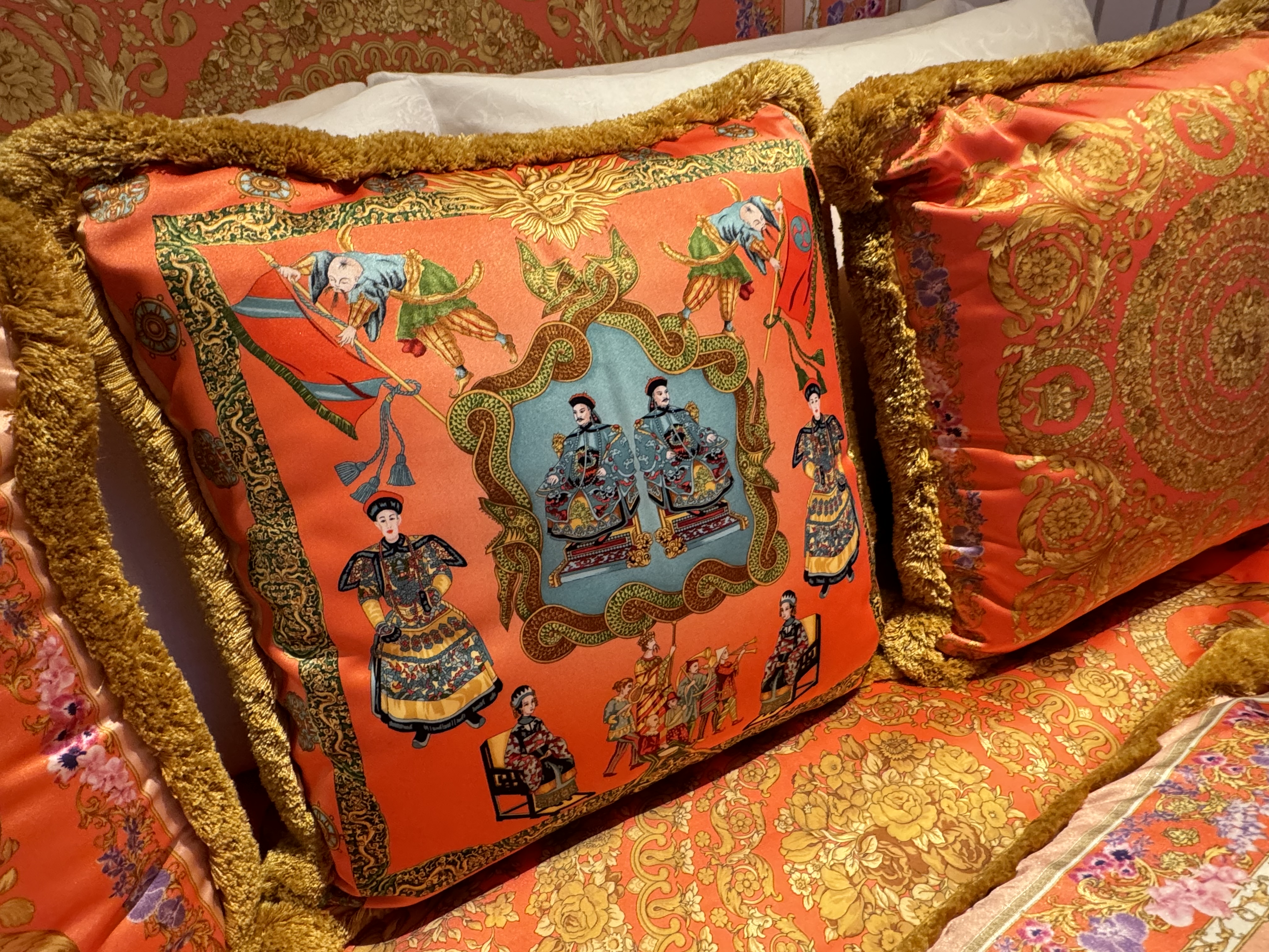 宿泊のヴェルサーチホテルの感想ですが、ホテルが新しいのでキレイなのは当然ですが、ヴェルサーチデザインのベッドカバーやクッションがゴージャスです。