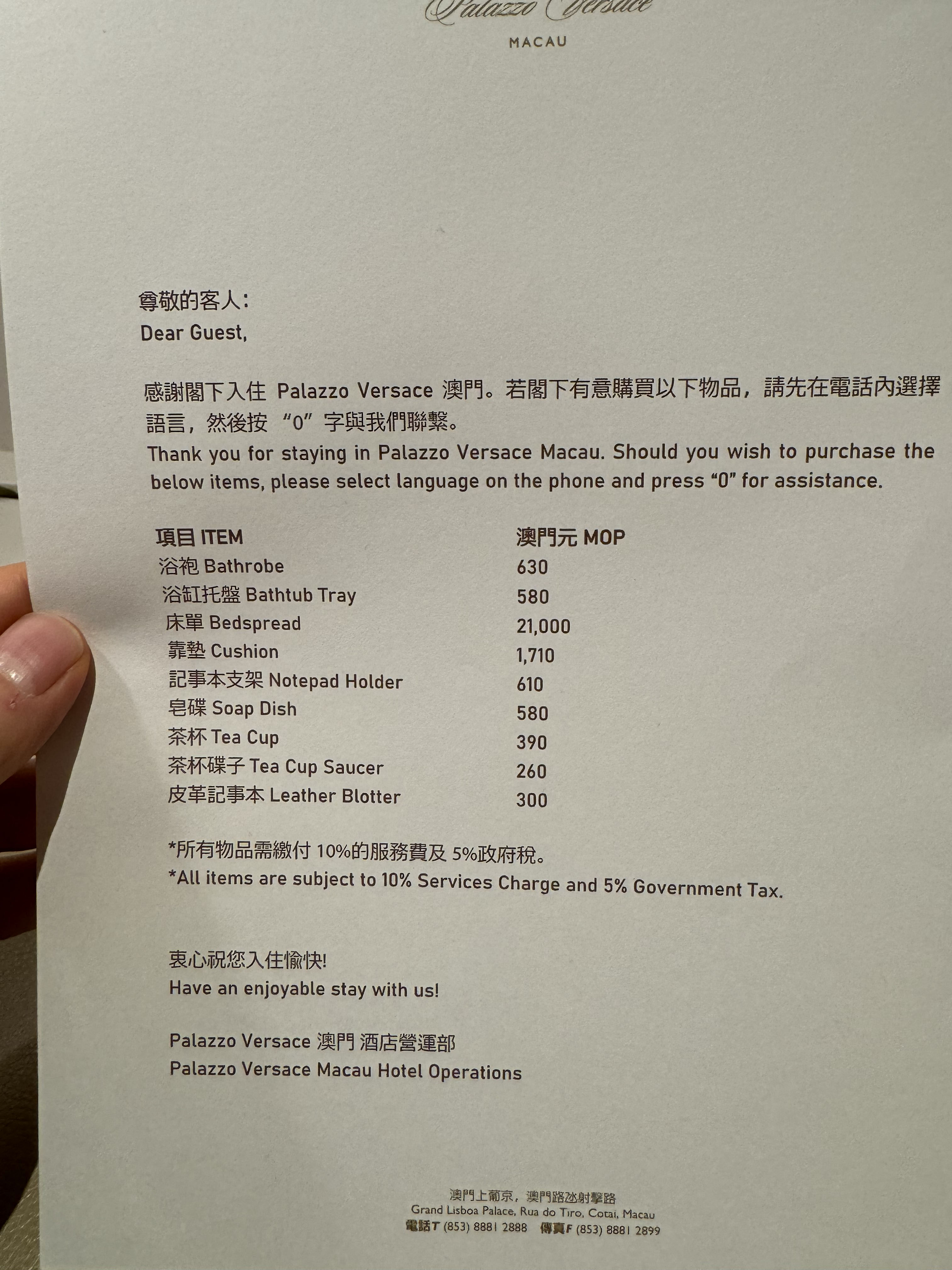 客室のベッドカバーは21,000MOP(約40万円)で購入出来るようです