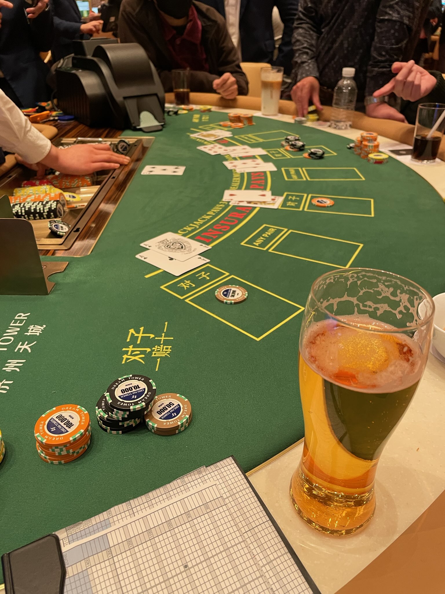 しばらく気を静めるため、ゆったりと仲間内で固めた卓でBJを楽しみます。