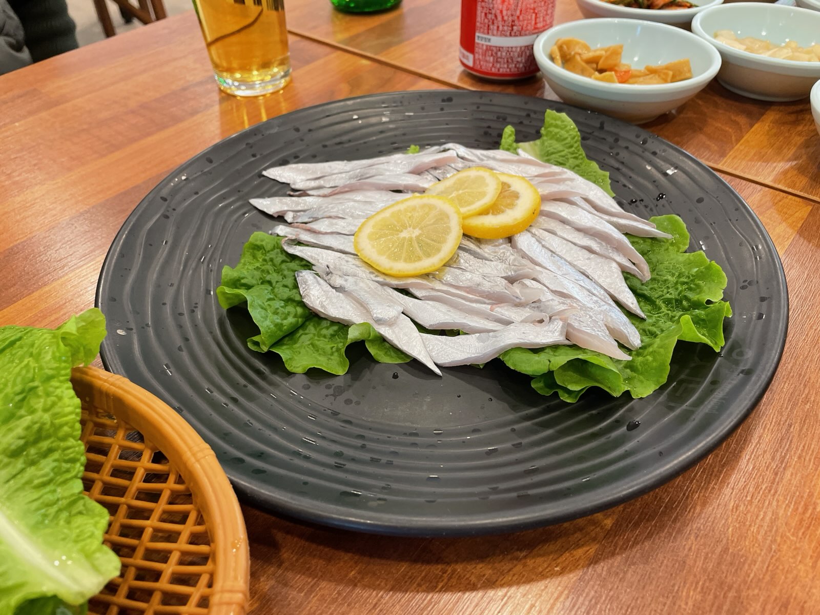 昼はドライバーさんと一緒に太刀魚の刺身や海鮮鍋をいただきます。