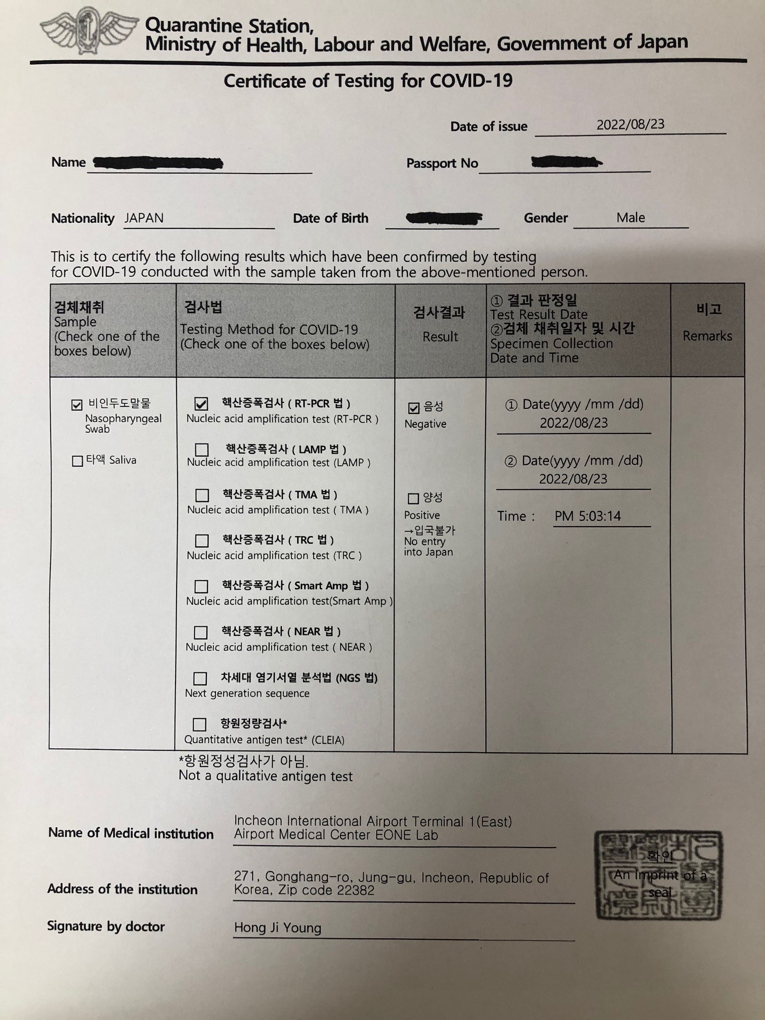 (唾液か鼻ぬぐい液)(出国前48時間以内のPCR検査結果か、24時間以内の抗原検査結果の英語か韓国語の証明書)1万円程度です ※証明が日本語のみのものや時間外のものはアウトです