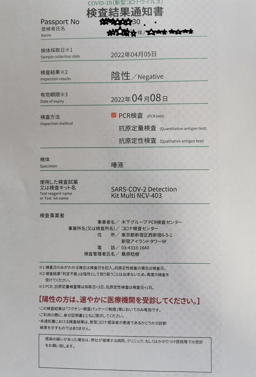 出国に際して用意するものは マークさんの詳しい説明付きのリゾカジ・レポートがありますのでそれを参考いたしました。またお友達が3月に早速行ってきましたのでいろいろお話を聞いていました。まずは3回接種の証明書を保健所に申請いたしました。書類は無料ですぐに届きました。一番の問題は72時間以内の陰性証明書。これは新宿の木下グループのPCR検査センターで都民無料の陰性証明書をゲットです。翌日メールが届きますが陰性証明の欄を見るときは久しぶりにドキドキしました。(ちむどんどんさぁ~)