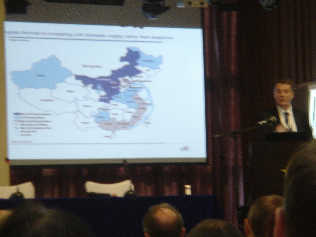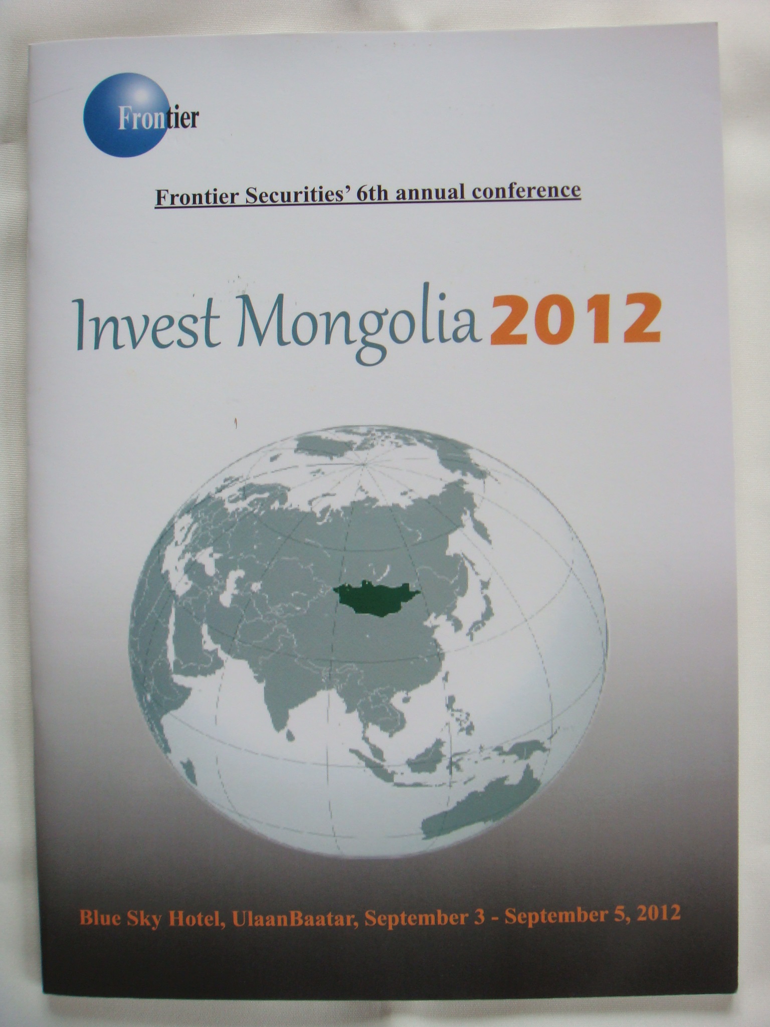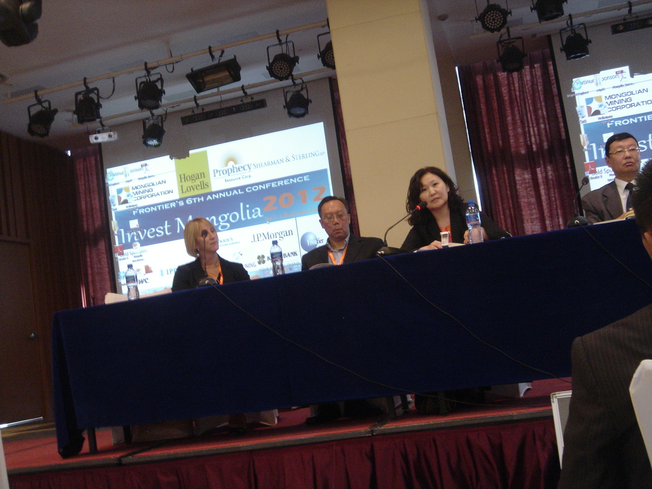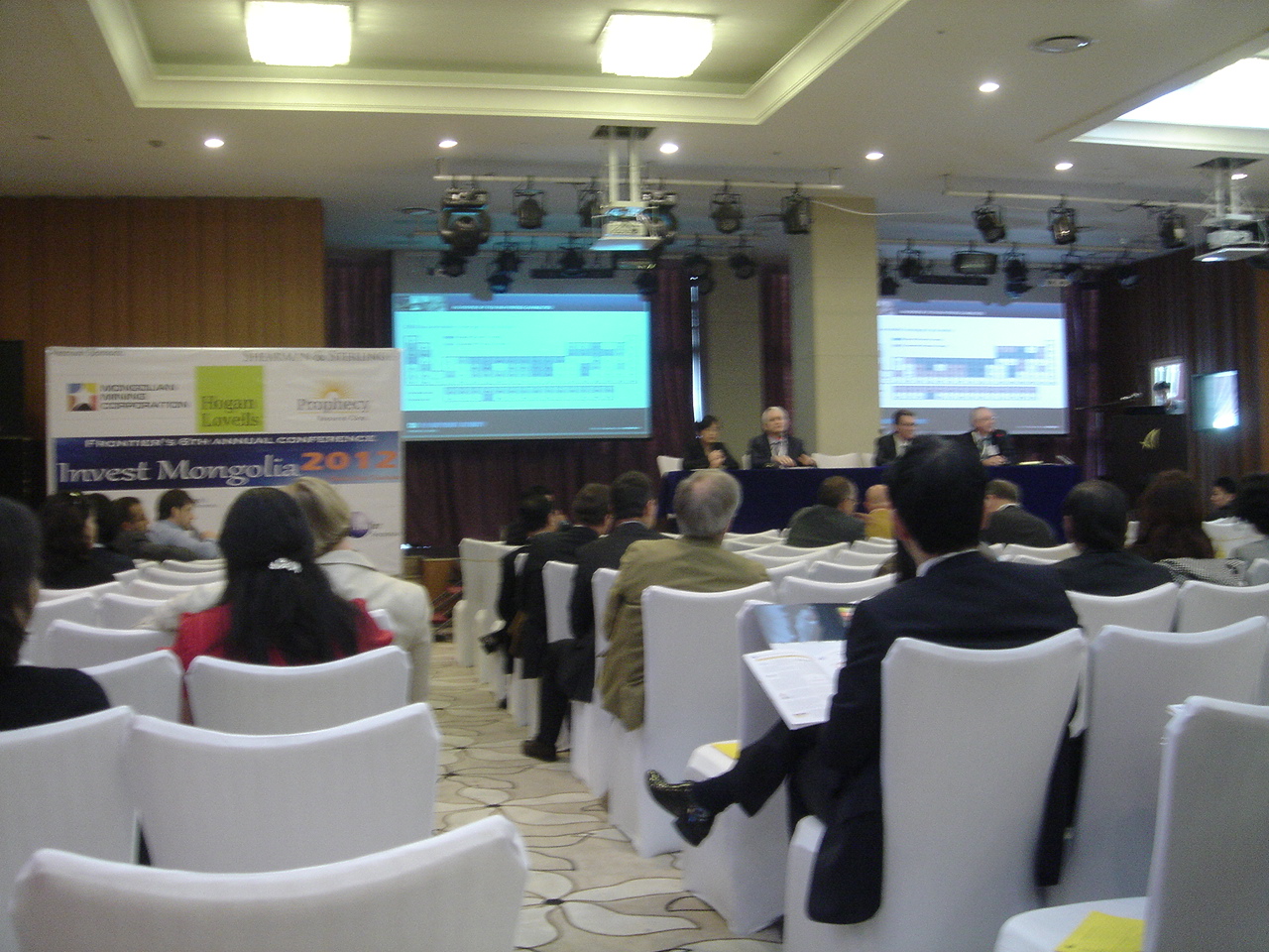9月3日(月)。ブルースカイホテル内の会議室で開催された「インベストモンゴリア2012」に参加。スピーチは英語が基本ですが、モンゴル人スピーカーの中には英語の喋れない人もいました。日本の沢田ホールディングス(8699.JASDAQ)が出資するハーン銀行からは加藤紀彦副頭取がスピーチ。「7月の石炭輸出が7割減少した」というのには驚きました。スピーチ後に加藤副頭取と名刺交換。生まれて初めてのビジネスランチでは、同席した同銀行のMining Banking Divisionの行員と「資源株は値動きがボラタイルだ」などとお話しました。