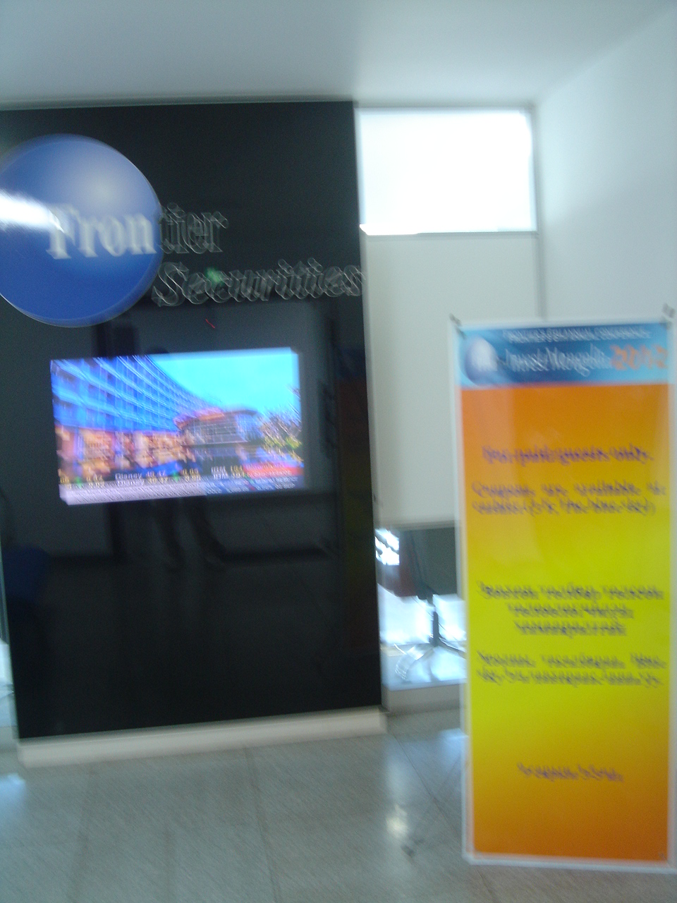 タワー内のブルースカイホテルにチェックイン後、7階にあるフロンティア証券を訪問。CEO1名に日本人社員1名、モンゴル人アナリスト1名という陣営で、ほかにワーキングホリデーで英国人学生1人が働いていました。オフィスと会議室を見せてもらい、鉱山ツアーの代金や、会議のランチ50ドル×2回、ディナー100ドル+150ドルなどを支払いました。