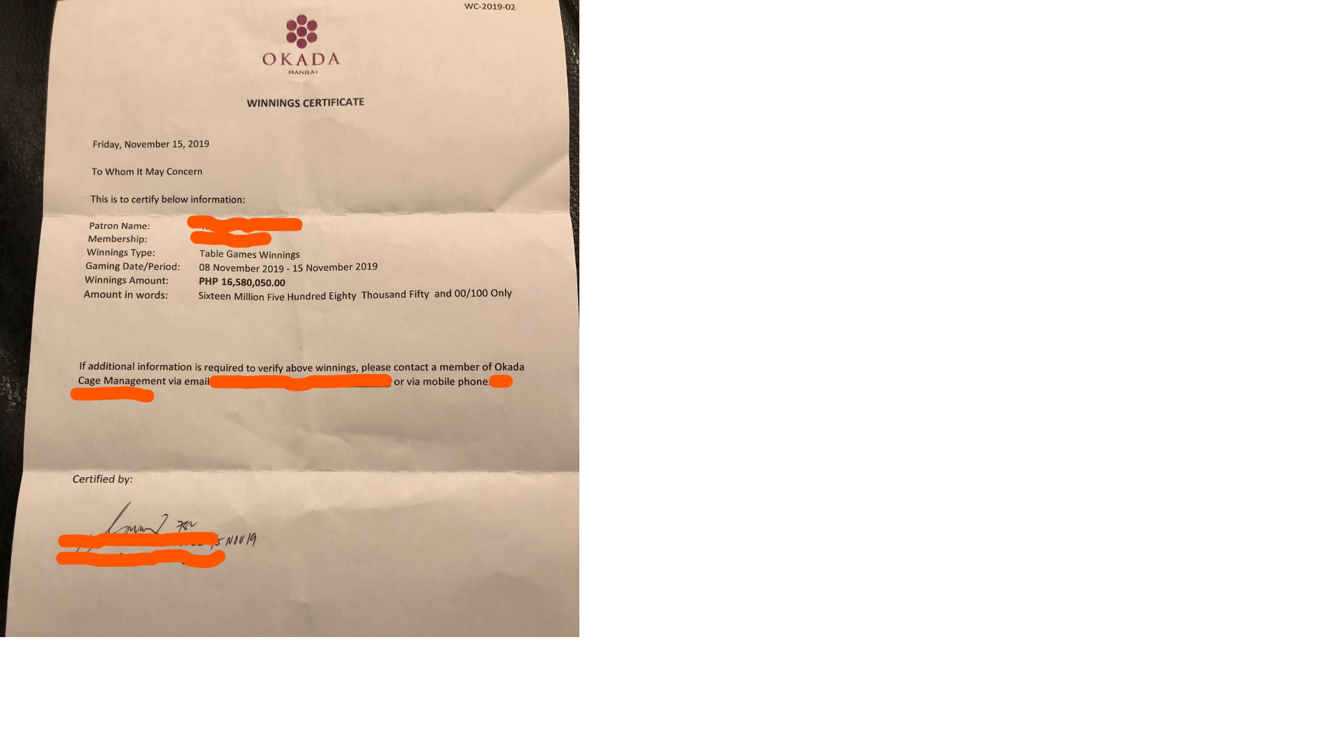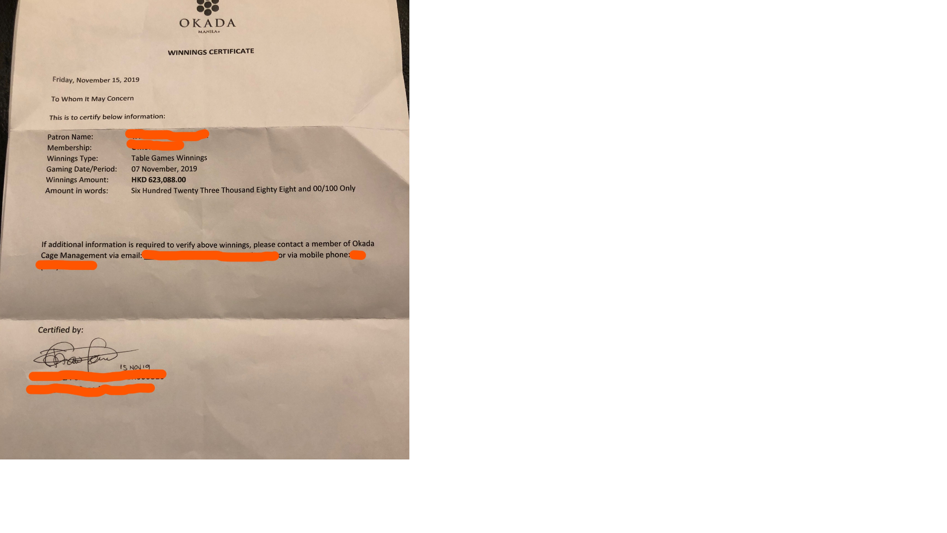 カジノから発行されたwinning certificateを見せ、特に問題はありませんでした。