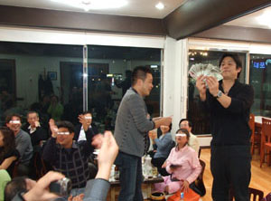 ようやく卓についたのが食事会が終わって一息ついた夜の10時ごろでしょうか。一進一退が続き日付も変わり夜中の2時頃、私はその日の勝ち目標額に到達し寝に行くことに。同部屋だったので