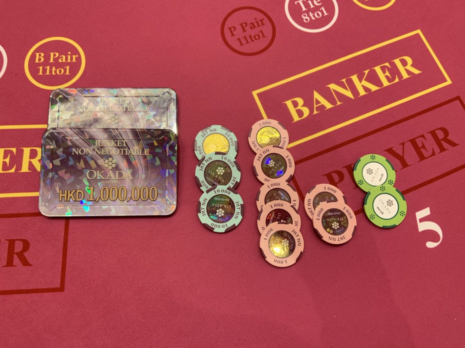さて戦闘開始。200万HKドルを出します。大きいサイズの100万ドルのビスケット1枚、小さいサイズの10万ドルのビスケットが8枚、1万ドルのチップ19枚、1000ドルチップ10枚。最初のベットは基本形の1万ドルチップ2枚。バンクで当たります。