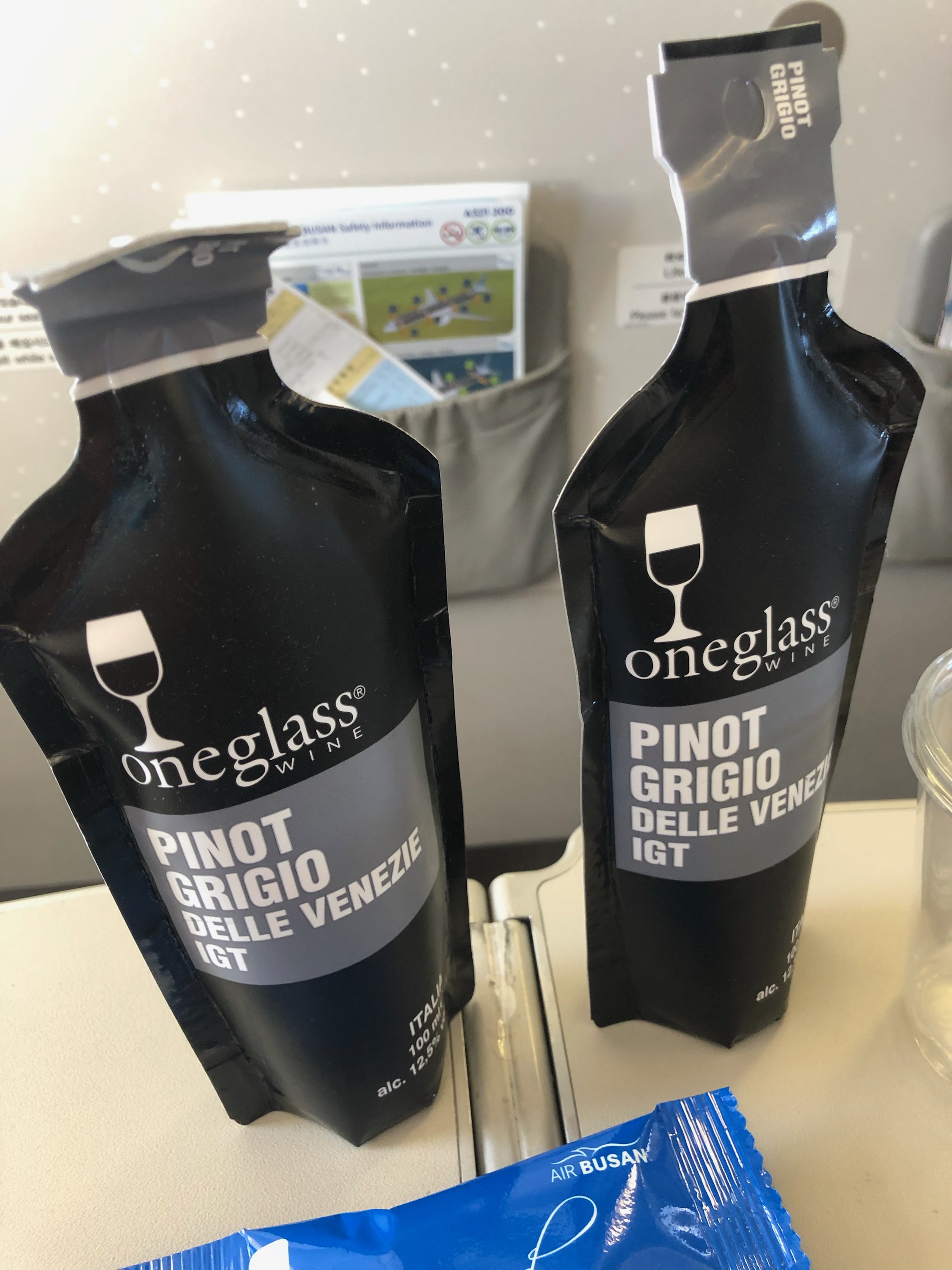 往路便は12時発のBX115便、機内にて勝利を願ってワインで乾杯します。