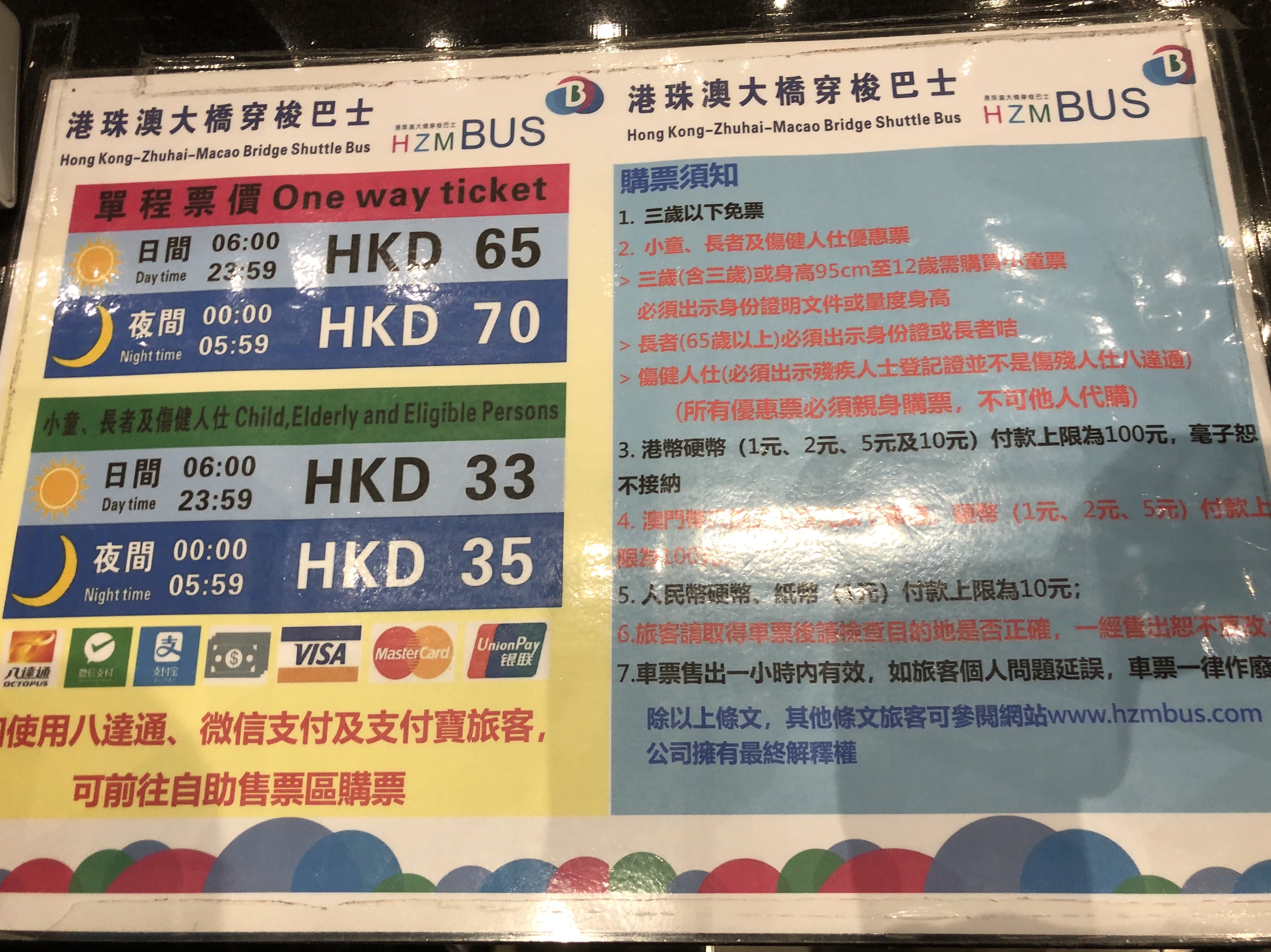 1回目は、102Xバスで6MOP・HZMBバスで65MOP・B4バスで6HKD