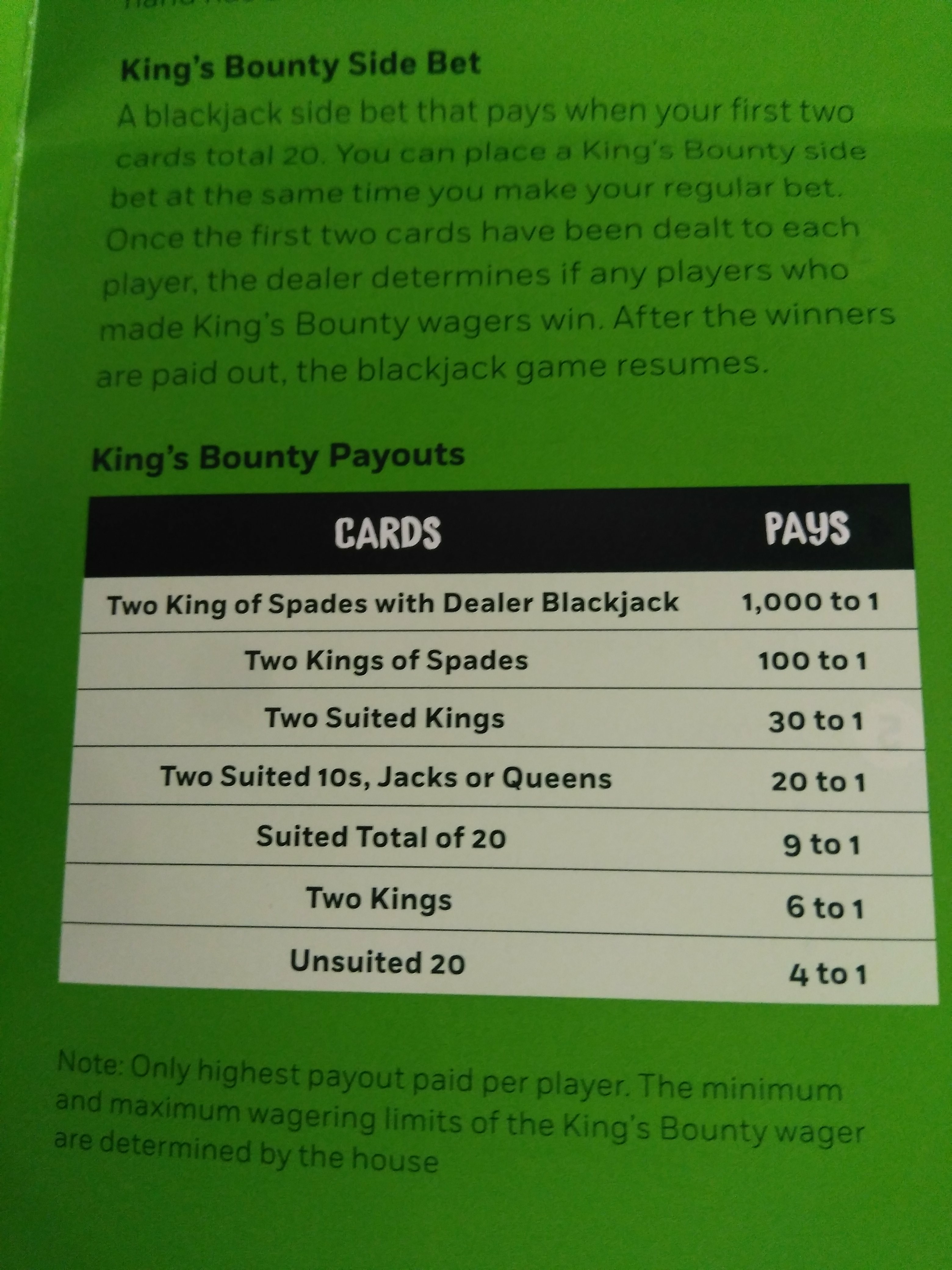 バンクーバーの2店舗では、以前にあったサイドベット、Q+Qのラッキーレディースはなくなり、K+KのKING’S BOUNTYに統一されている。KING’S BOUNTYは添付写真の配当詳細を見て頂きたい。このサイドベットは地元プレーヤーはお楽しみでかなりベットしているが、ハウスエッジ的にはかなり不利になるだろう。