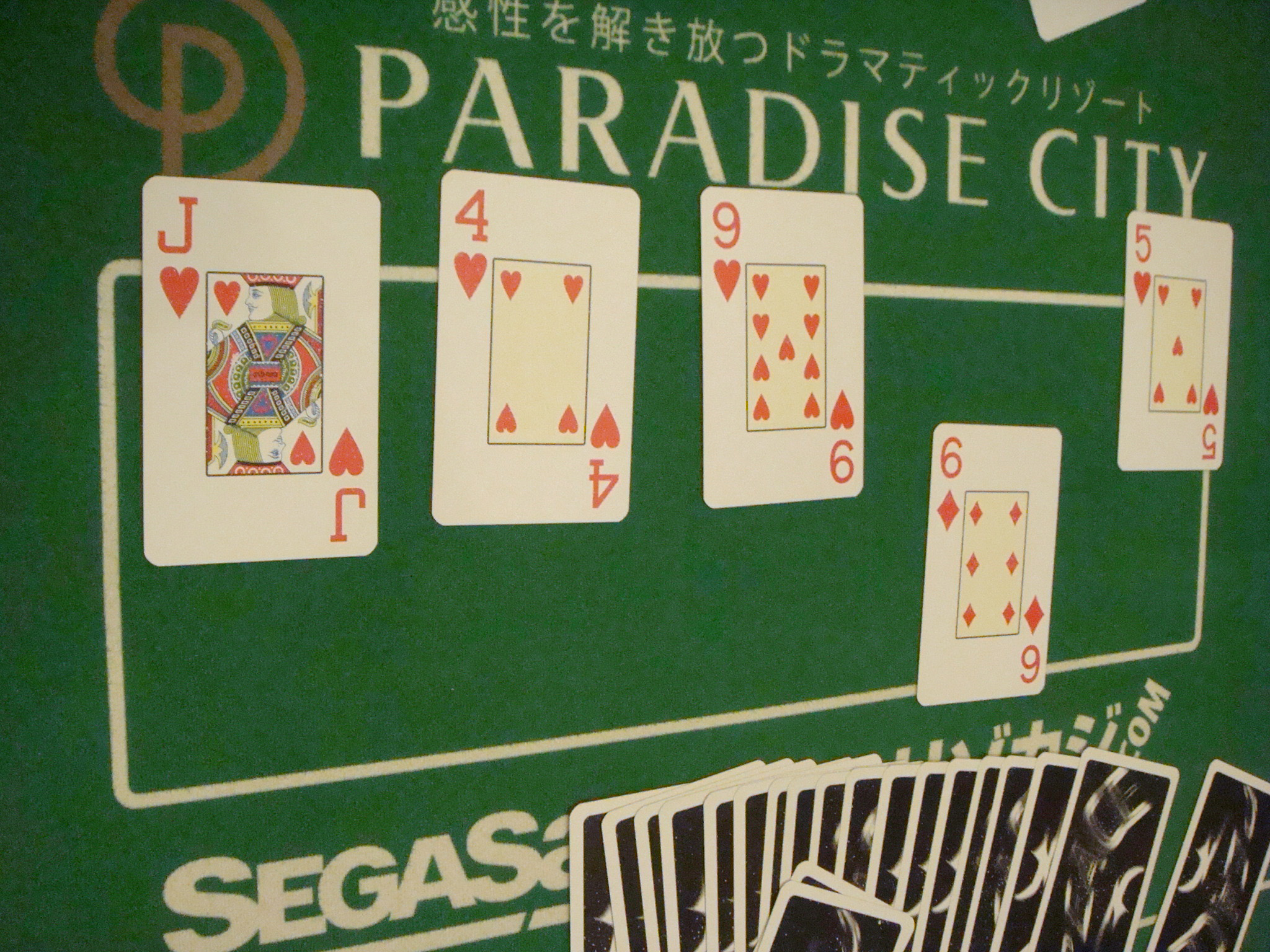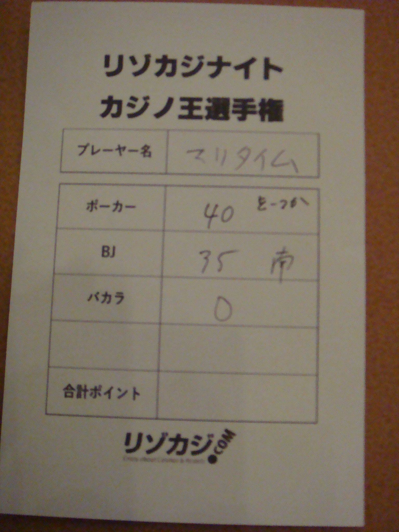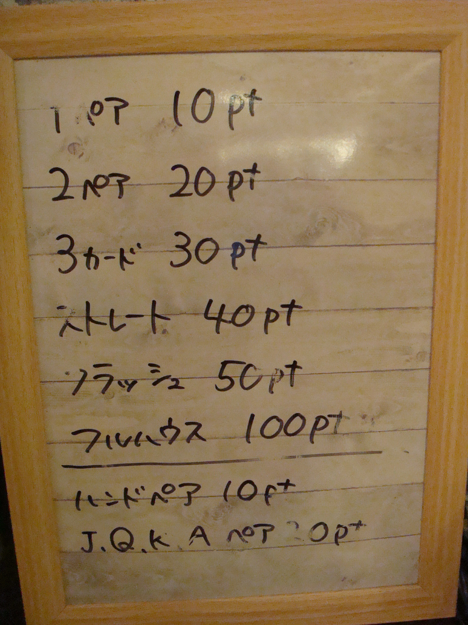 白の得点票の私は、最初はポーカーです。4ゲームを行い、できた役に応じてチップが与えられるルールです。自分は4ゲームすべてワンペアで計40ドルを獲得しました。