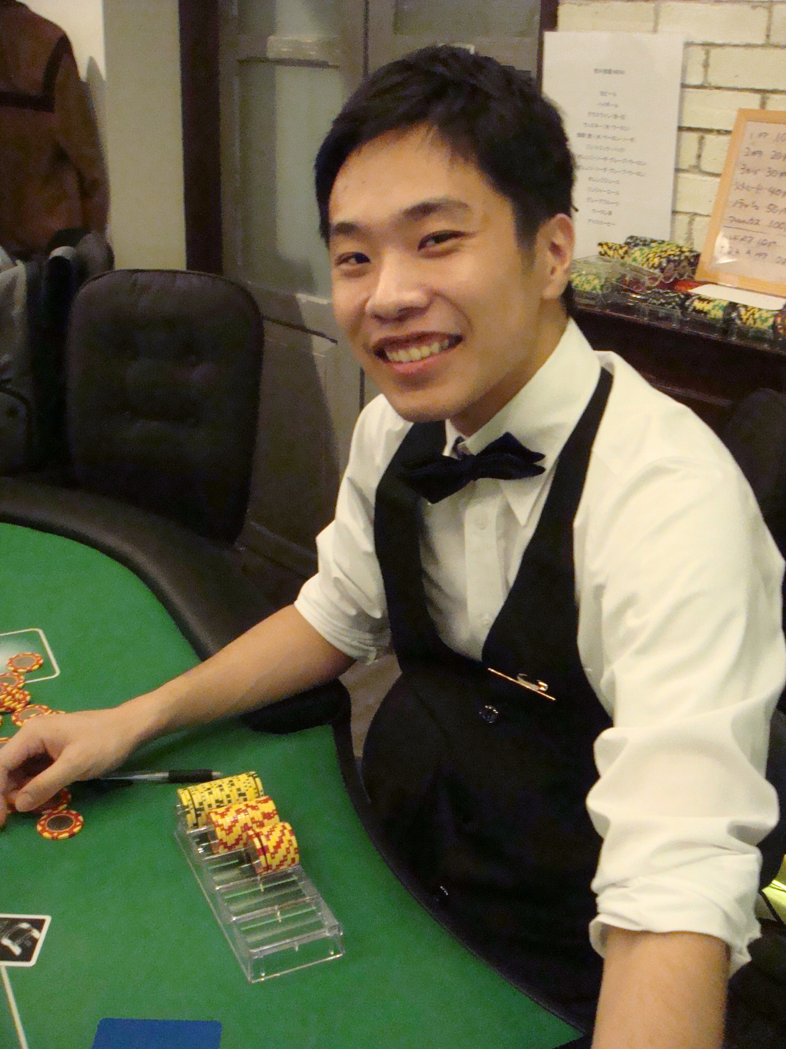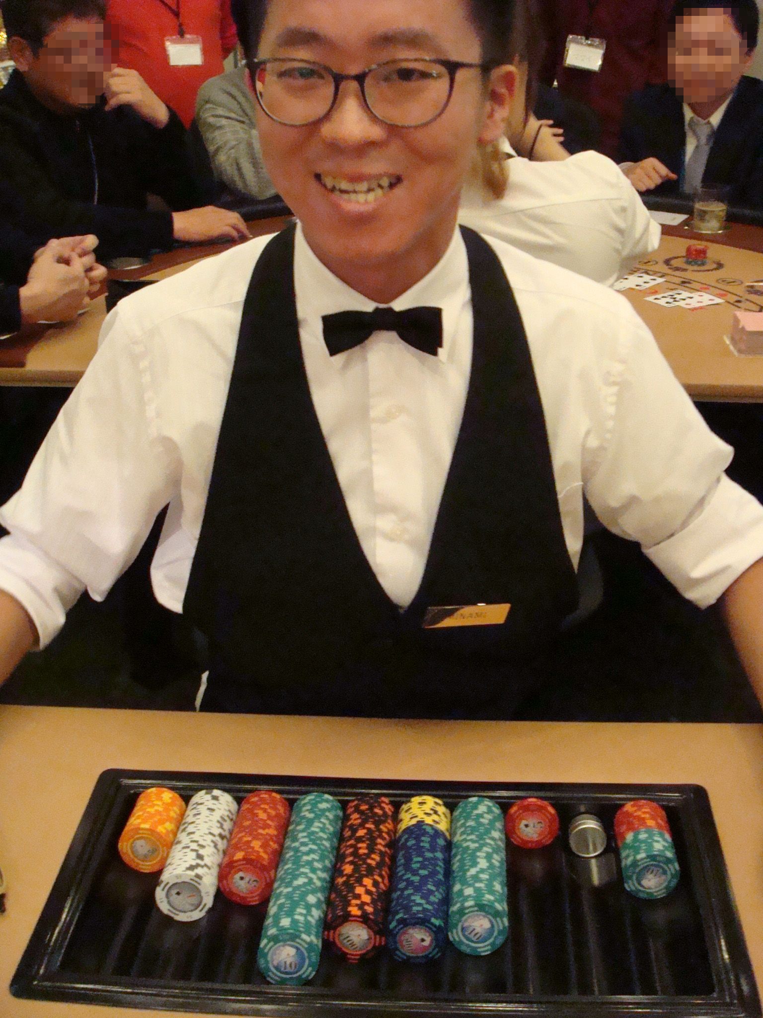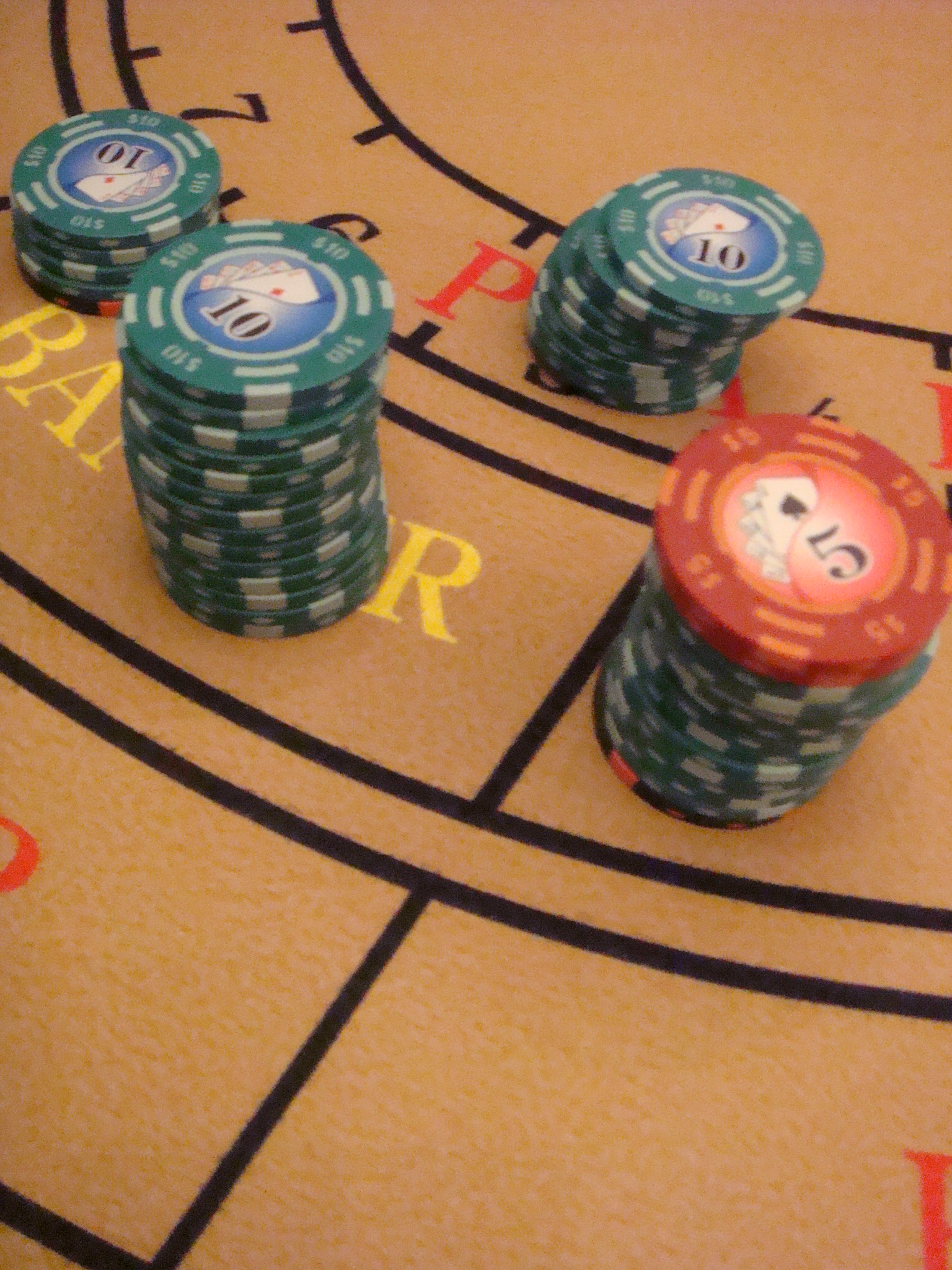 右隣に座っていた人道人間さんは、最初から好調な様子でしたが、4ゲーム目か5ゲーム目に、メインベットとペアに分けてチップをオールインしました。すると、2枚とも9が配られ、ペア成立。さらに大きくチップを増やしておりました。そして「俺は本当は(バカラよりも)ブラックジャックが強いんだ!」と。水晶宮でバカラテーブルに中宝さんと二人で座って、仲間の賭けを眺めながら楽しそうにバカラ談義をしているイメージが強いですが、何とそれは仮の姿だったのです!
