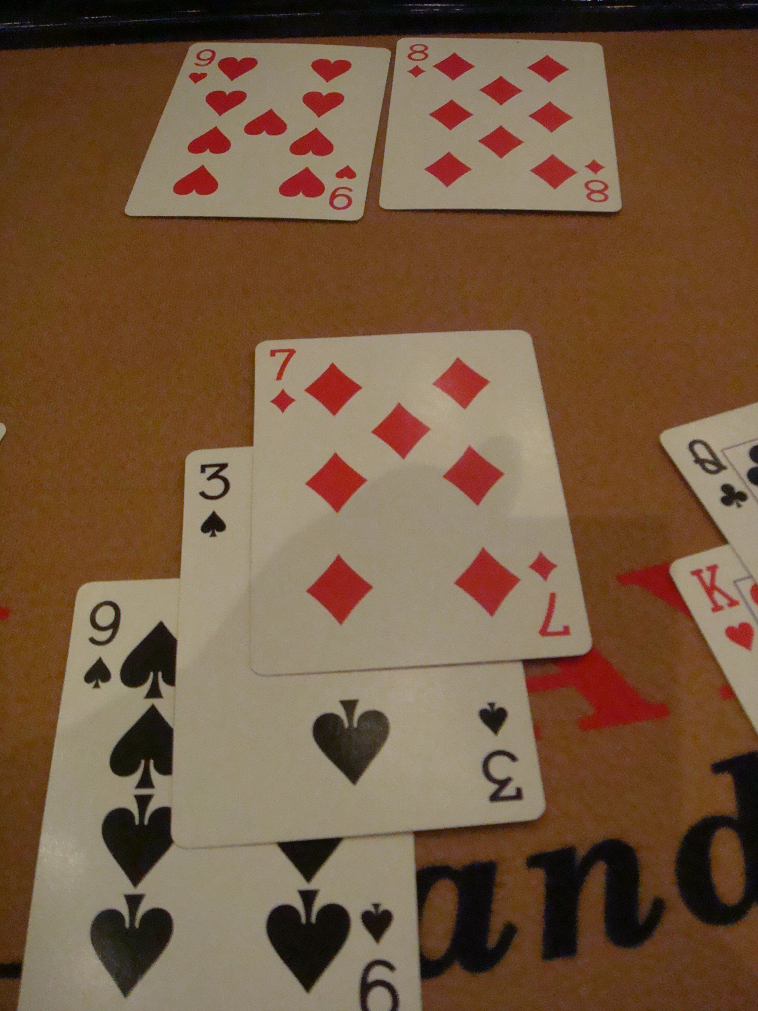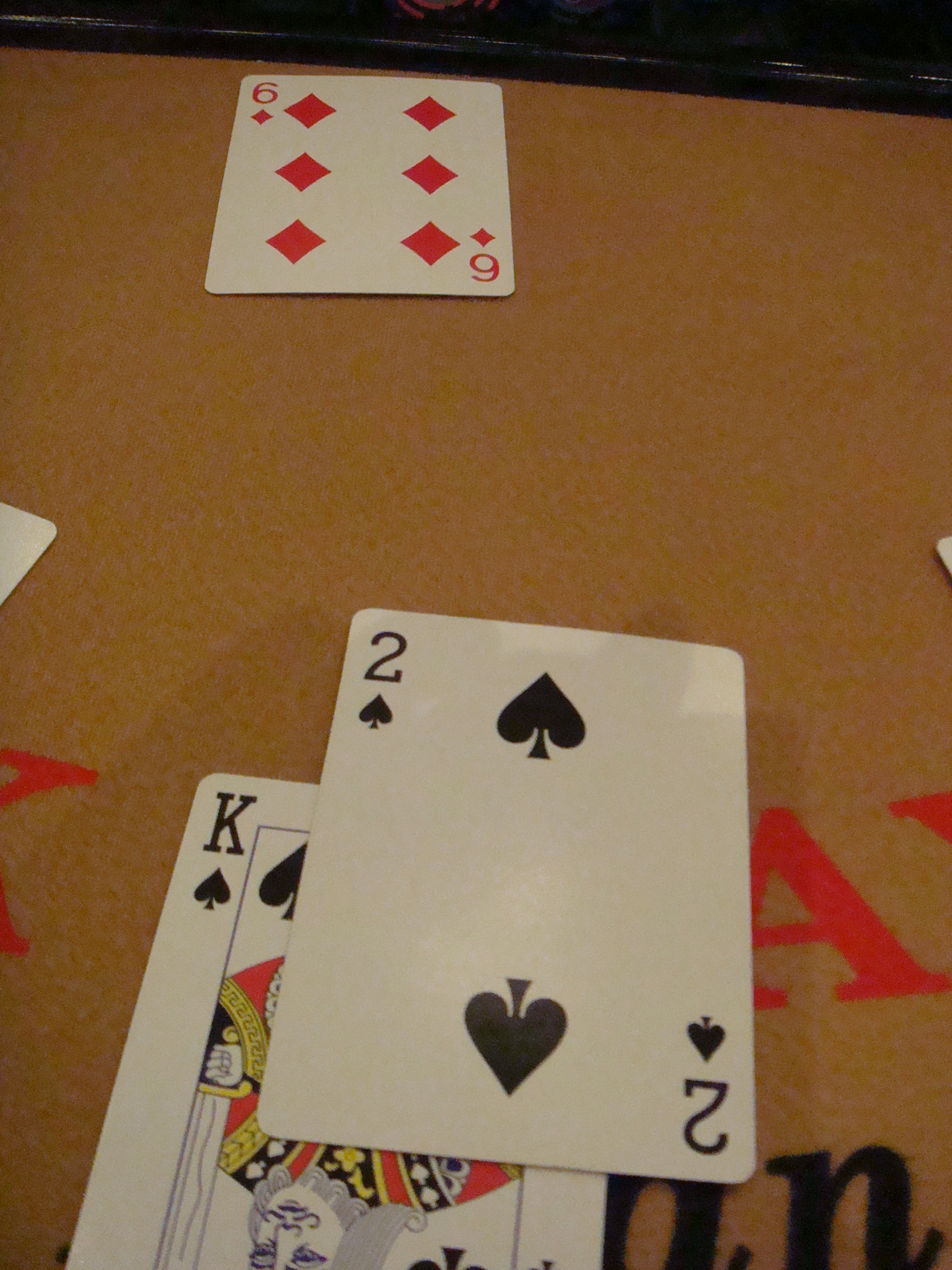 1ゲーム目は10ドルを賭け、自分は12からヒットして19となり、ディーラーは17で初戦に勝利。2ゲーム目は20ドルを賭け、自分に配られた2枚の和はまたも12で、ディーラーの1枚目は6という状況。「これってベーシックストラテジーでは、ステイですよね?」とほかの人に確認をしてステイしました。次席の人はヒットせず、最後の席の人がヒットすると8が出ました。あちゃー、自分がヒットしてたら20になってました。そして、ディーラーの2枚目にAが出て12対17で敗北。