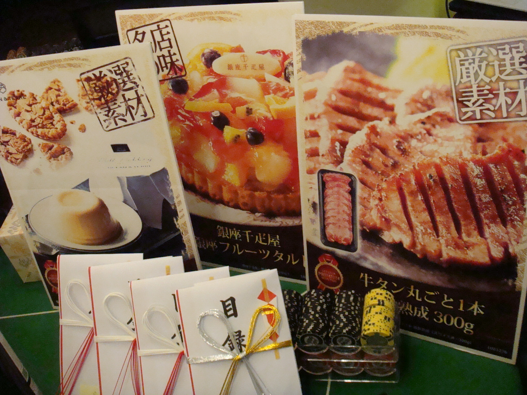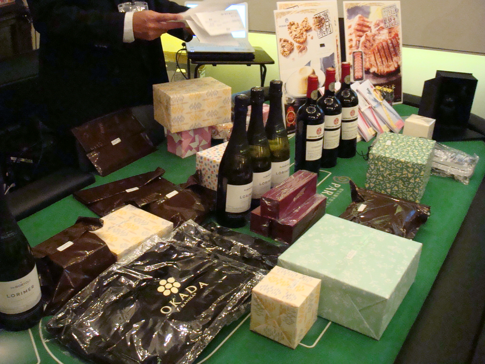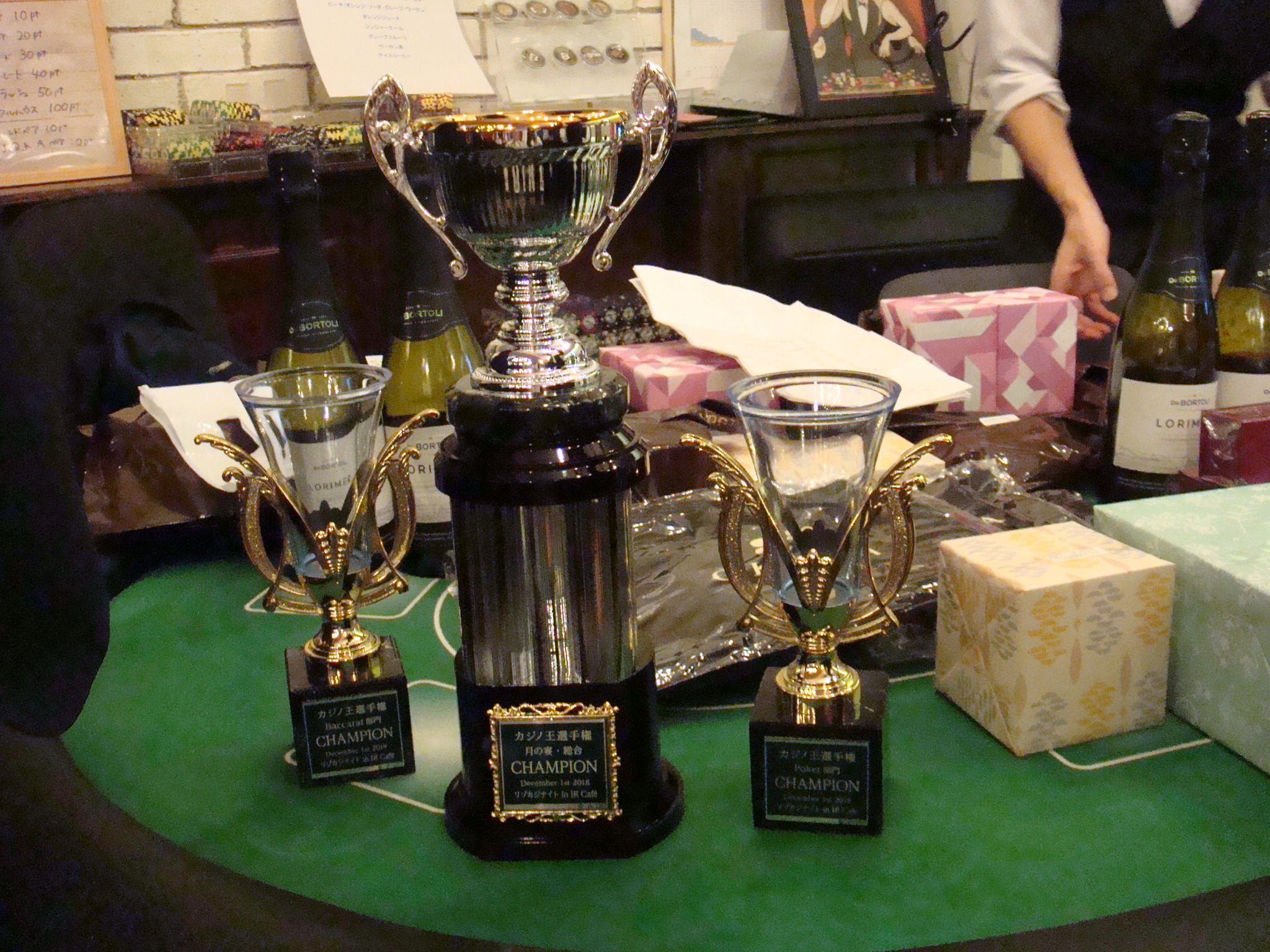 ゲームが終了すると、ポーカーテーブルの上にカジノ王決定戦のトロフィーと、後に行われるビンゴゲームの景品が並べられました。