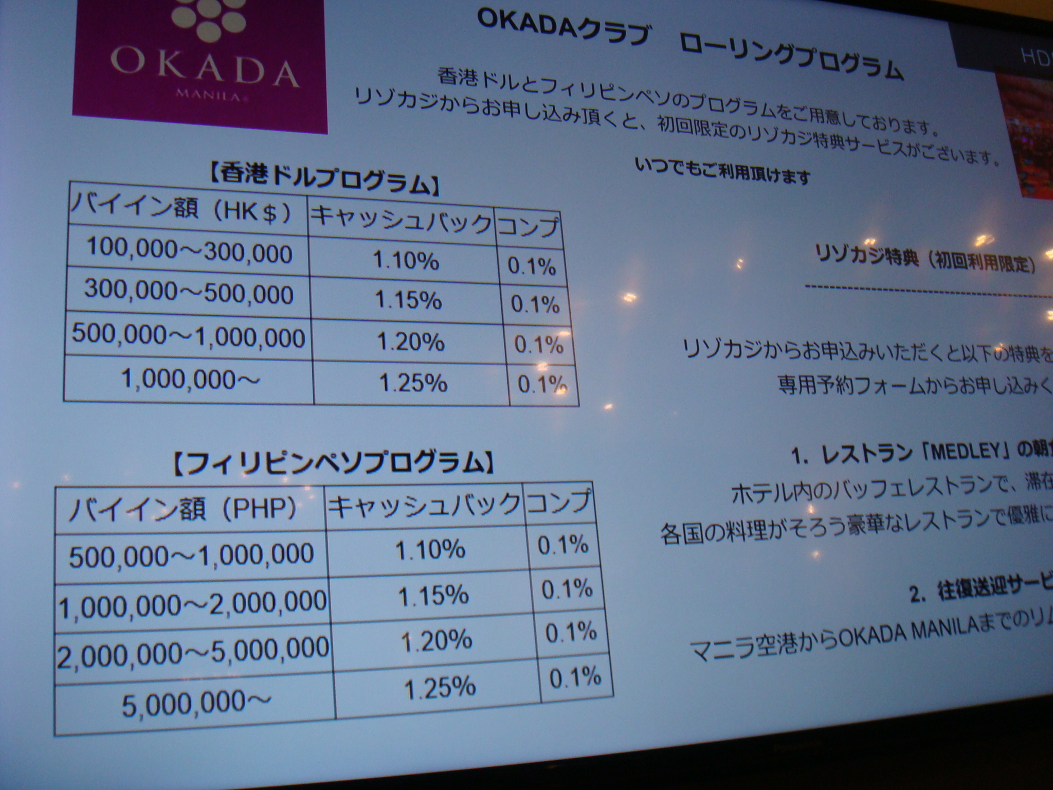 ちなみに私は、オカダマニラのペンをいただきました。中宝さんは見事パラダイスシティーホテルの無料宿泊券をゲットしていました。宿代タダでカジノでも大儲けとなればよいのですが、宿代以上に負けてしまい宿泊券さえ当たらなければ・・・という可能性も考えられます。後日、結果を聞いてみたいと思います(笑)。