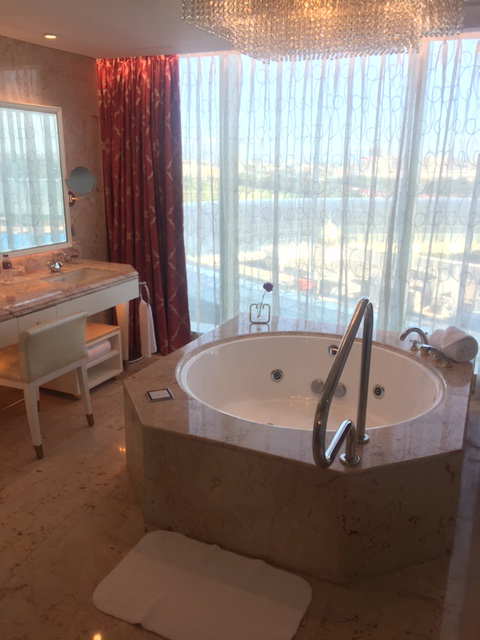 部屋は、全室ジャグジー付き。ファウンテン側で夜の噴水ショーは上からジャグジーに入りながら眺められそうです。(お仕事もあり朝風呂でしたが。。笑)