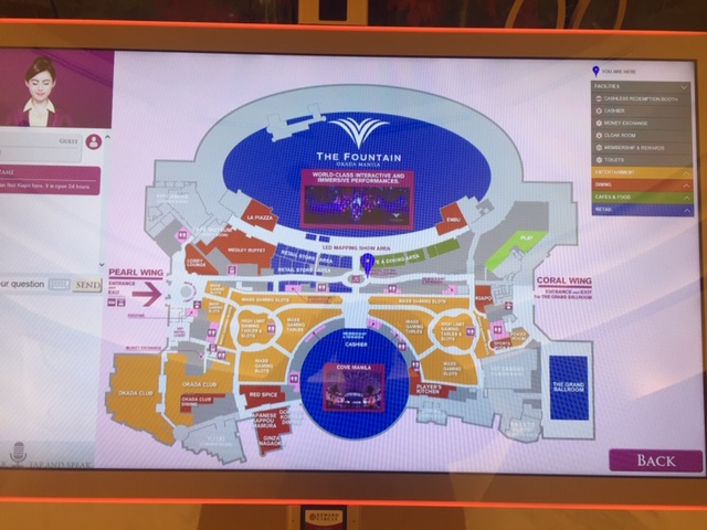 オカダマニラはMAPで言うと、上の方にファウンテン(噴水)がありその周りにレストランショップが連ねており、真ん中左右に長くカジノ、下の方の中央に、有名なCOVEがあります。