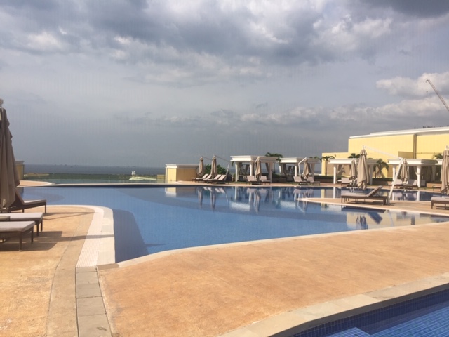 プール入口でおろしてもらいます。右に更衣室、左にタオルカウンター。プールはなかなかのインフィニティー感です。