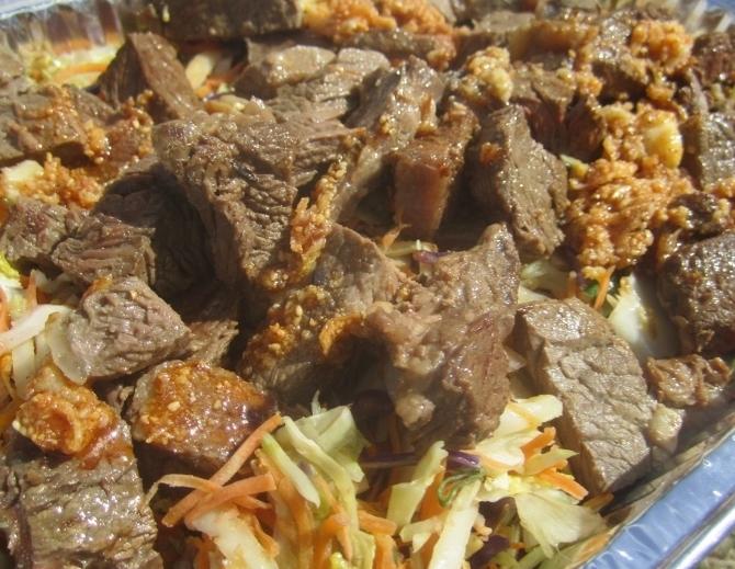 焼きあがると食べやすいように切って炒めた野菜の上に載せます。
