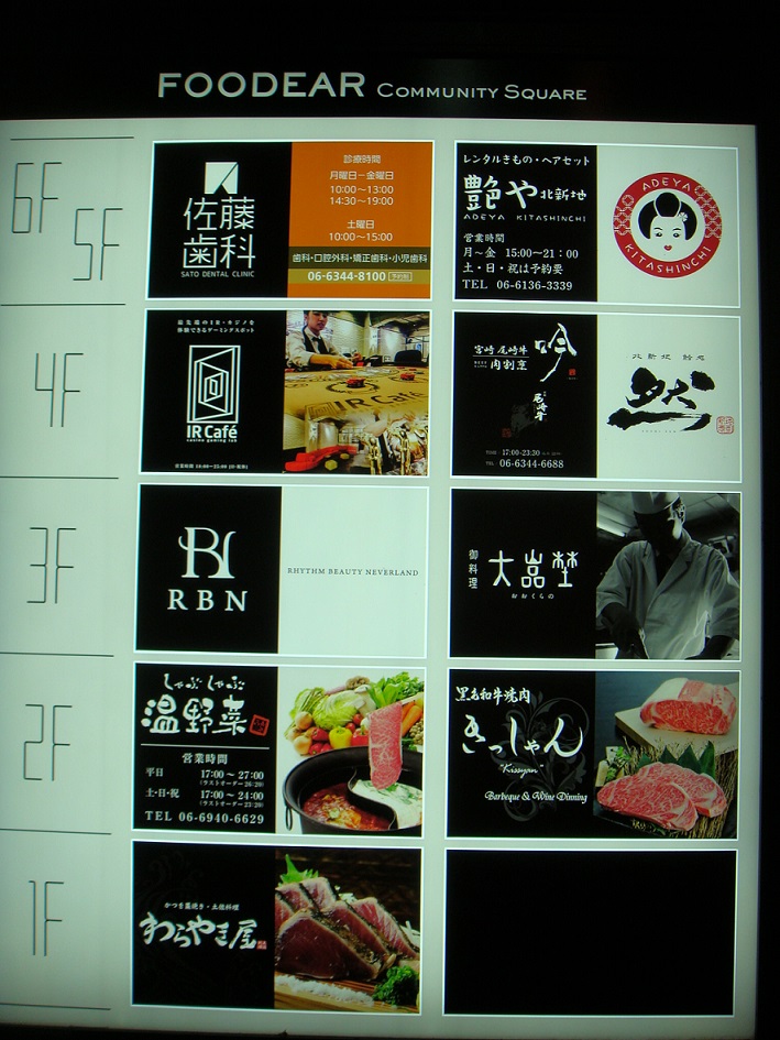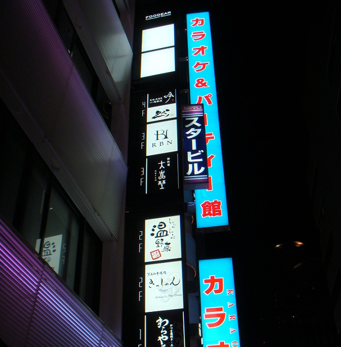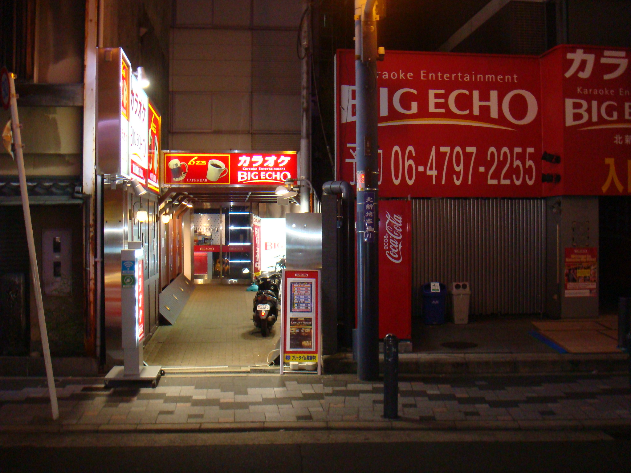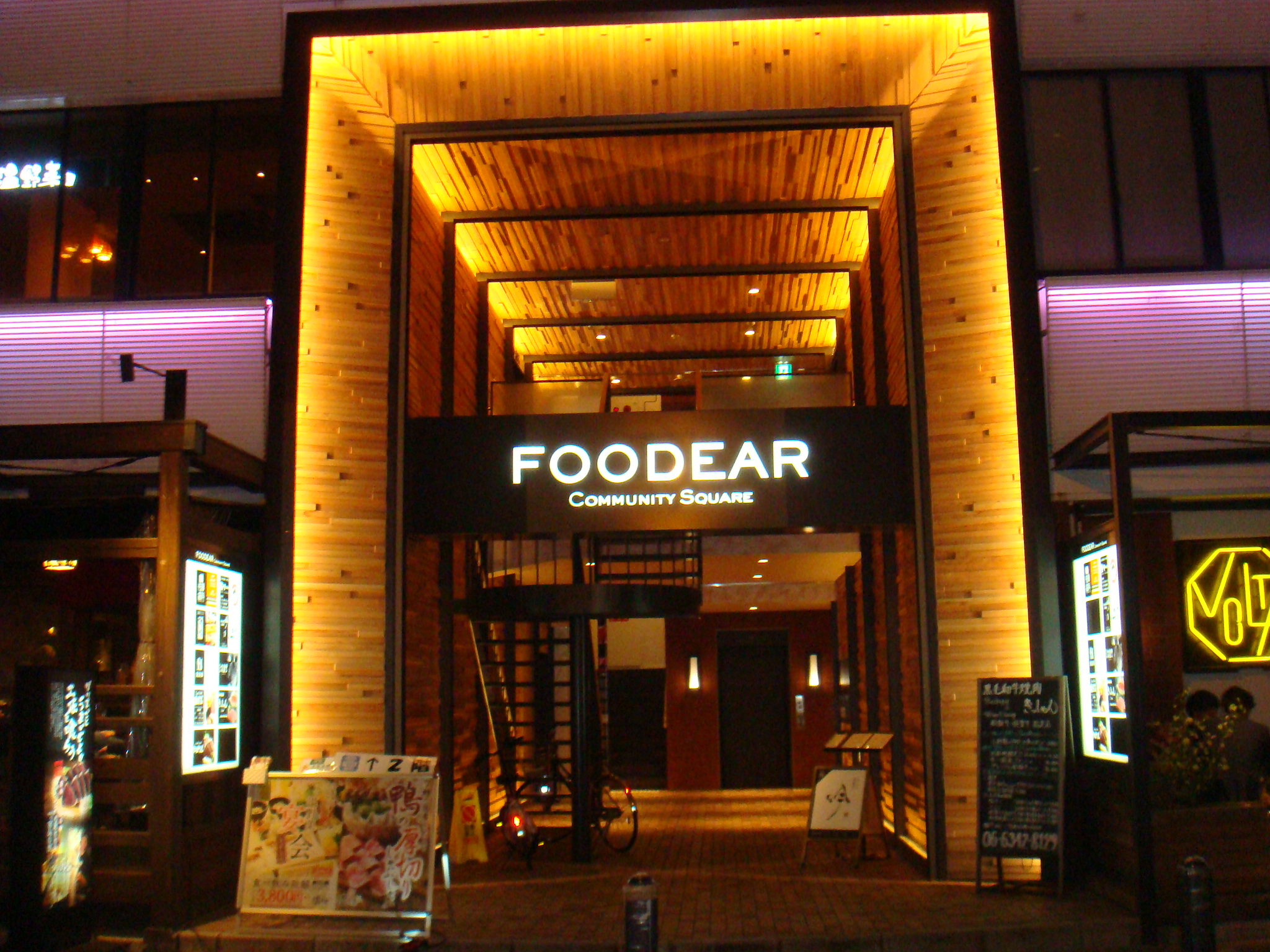 2018年11月2日(金)22時、大阪駅前。ヒルトンプラザ・イースト横の歩道を通って、四ツ橋筋を南に下ります。桜橋交差点の横断歩道を渡り、次の東西に延びる通りと交わる角(ドージマ地下センター入口のあるところ)を、左(御堂筋方向)に曲がりました。そして、少し進むと通りの南側に目指すFOODEARビルが見つかりました。横幅のある綺麗なビルです。道路をはさんだ反対側には、カラオケのビック・エコーがあります。