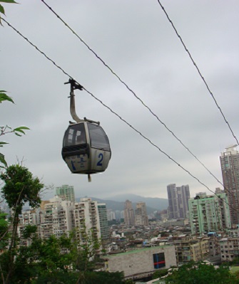 熊、猿、孔雀の檻、亀の池など、公園内を一通り回って、ロープウェイ乗り場へ。片道2バタカを払って、山頂駅までゴンドラに乗ります(8時から18時まで営業しますが、ロープウェイに乗らなくても石段を上がれば、すぐに山頂にたどり着きます)。