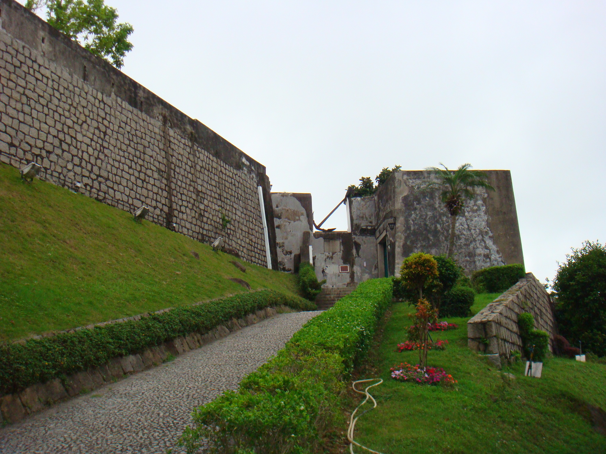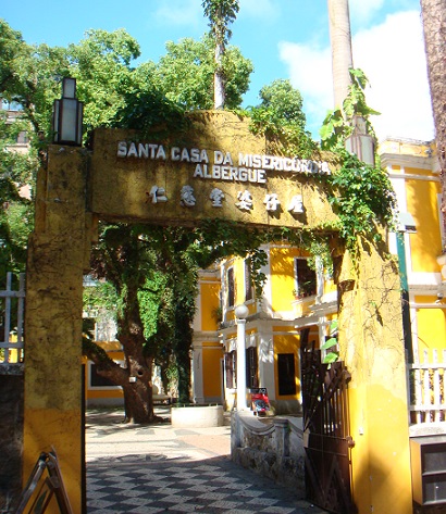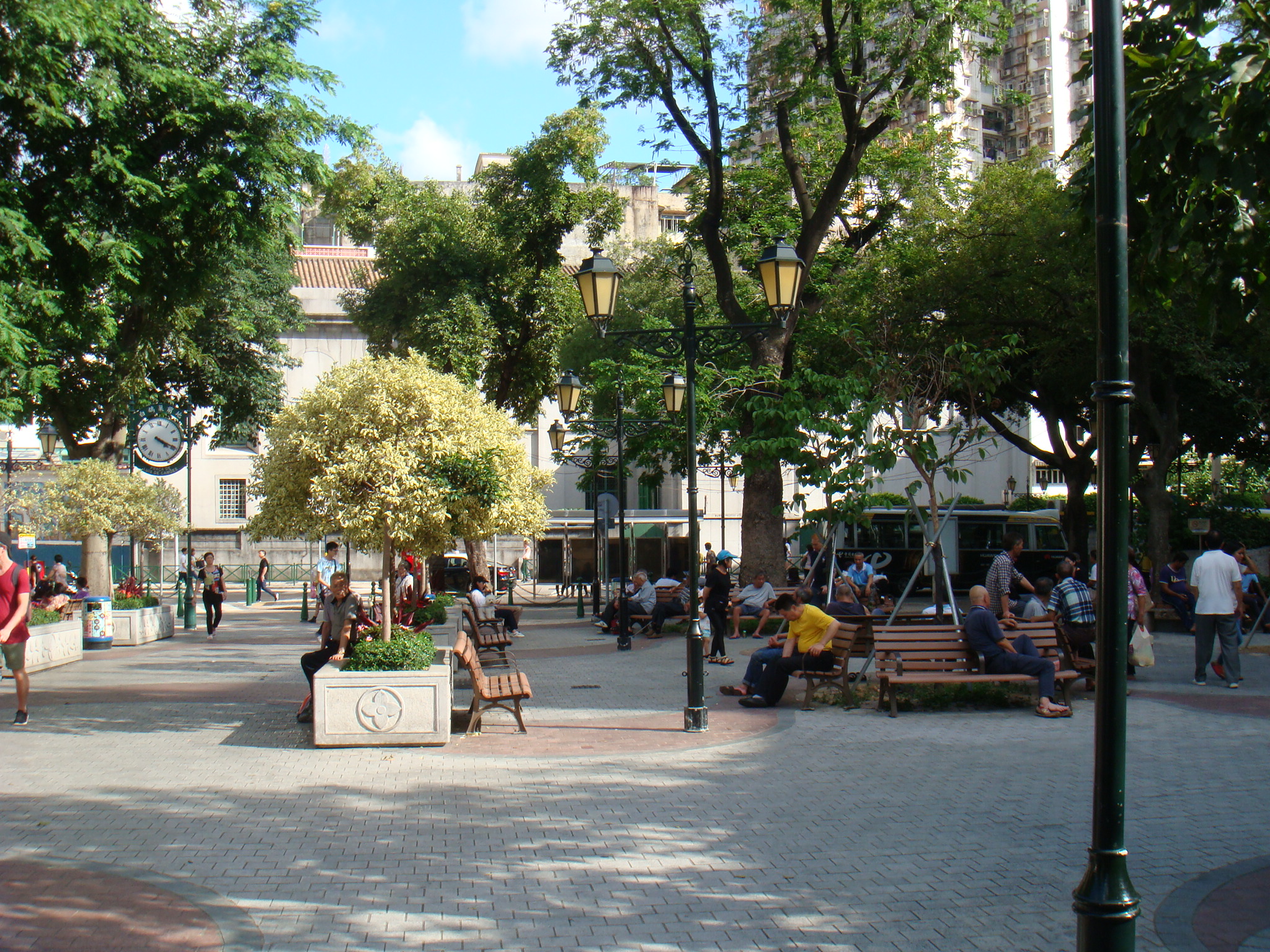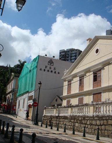 聖ポール天主堂跡方面へ向かう人波に身を任せ、クッキーを入れた紙バックを持って進んでいきます。しばらくして、大きな通りに出ました。右を見ると、グランドリスボアが見えたので左に進みますが、適当なところで、現在位置確認のため脇道に入り、道端に座りました。壁に社会保障基金と書いた建物が見えます。少し坂を上がったところには仁慈堂婆仔屋なる建物が。この二つで、聖ラザロ教会前の通りにいることが分かりました。