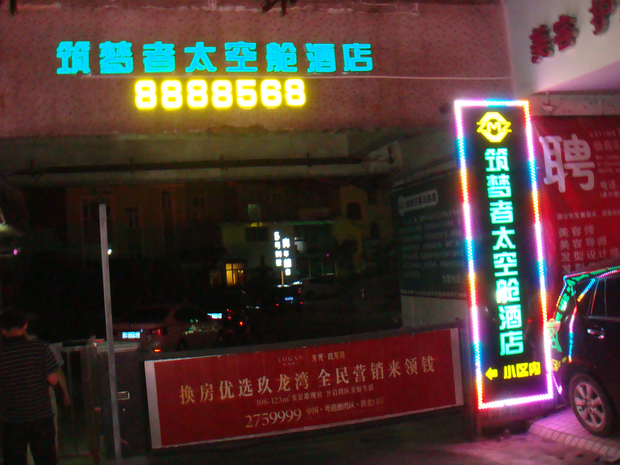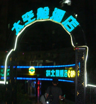 そして、ツヨシ99999さんとお別れして、3人で珠海筑梦者太空舱酒店水湾路店まで10分ほど歩きます。愛想の悪い守衛を突破して敷地の中へ(笑)。2人が無事にチェックインするのを見届けて、くるくるさんはタクシー乗り場へ戻っていきました。