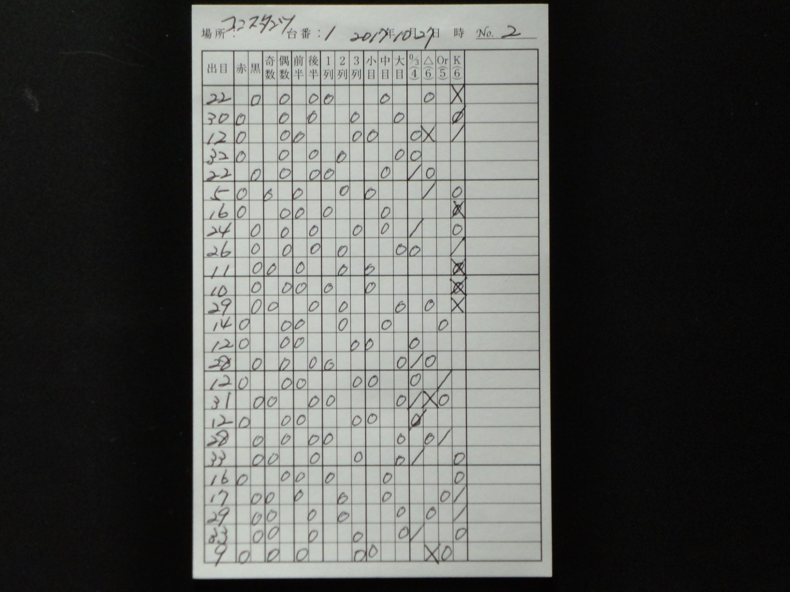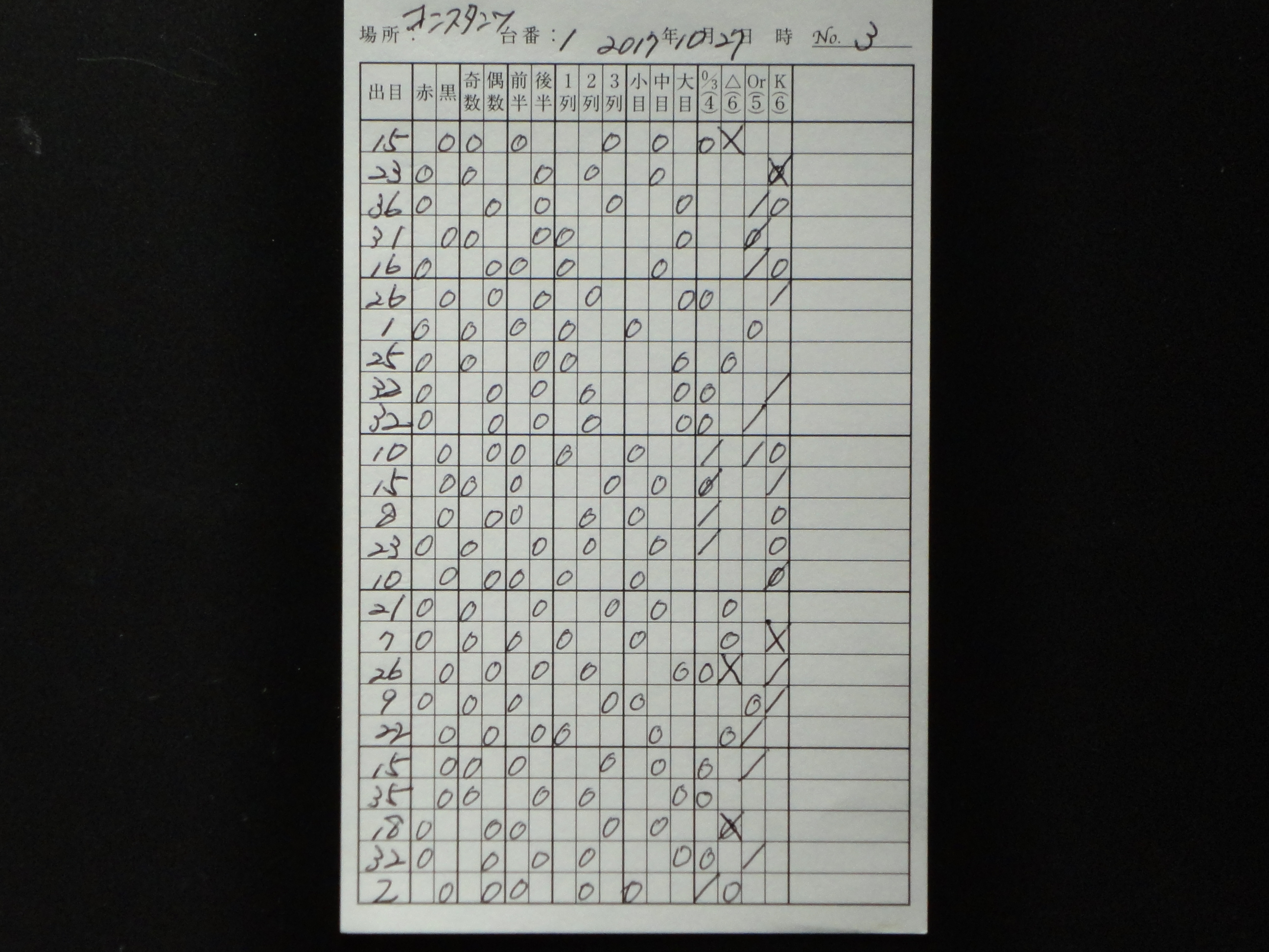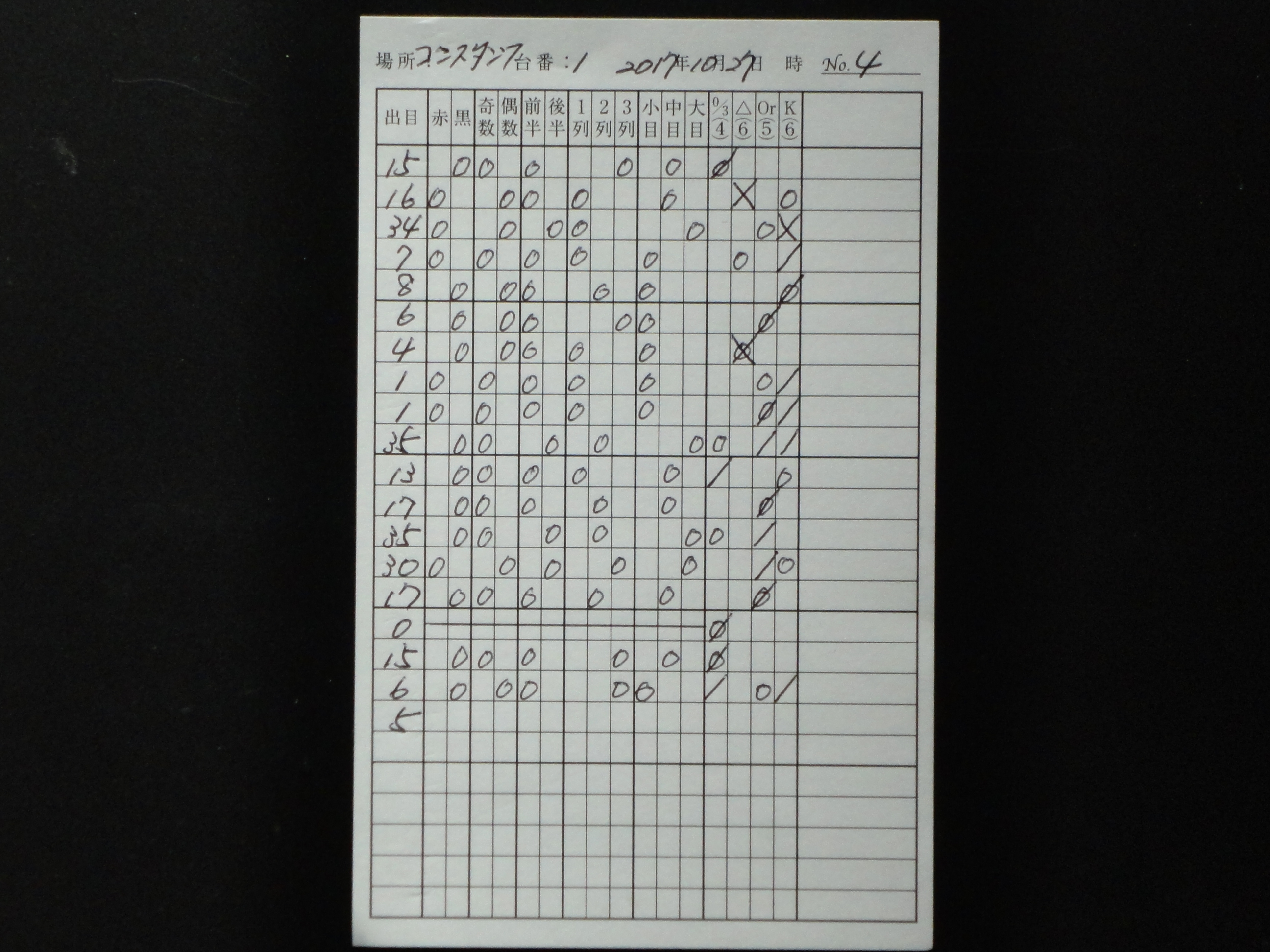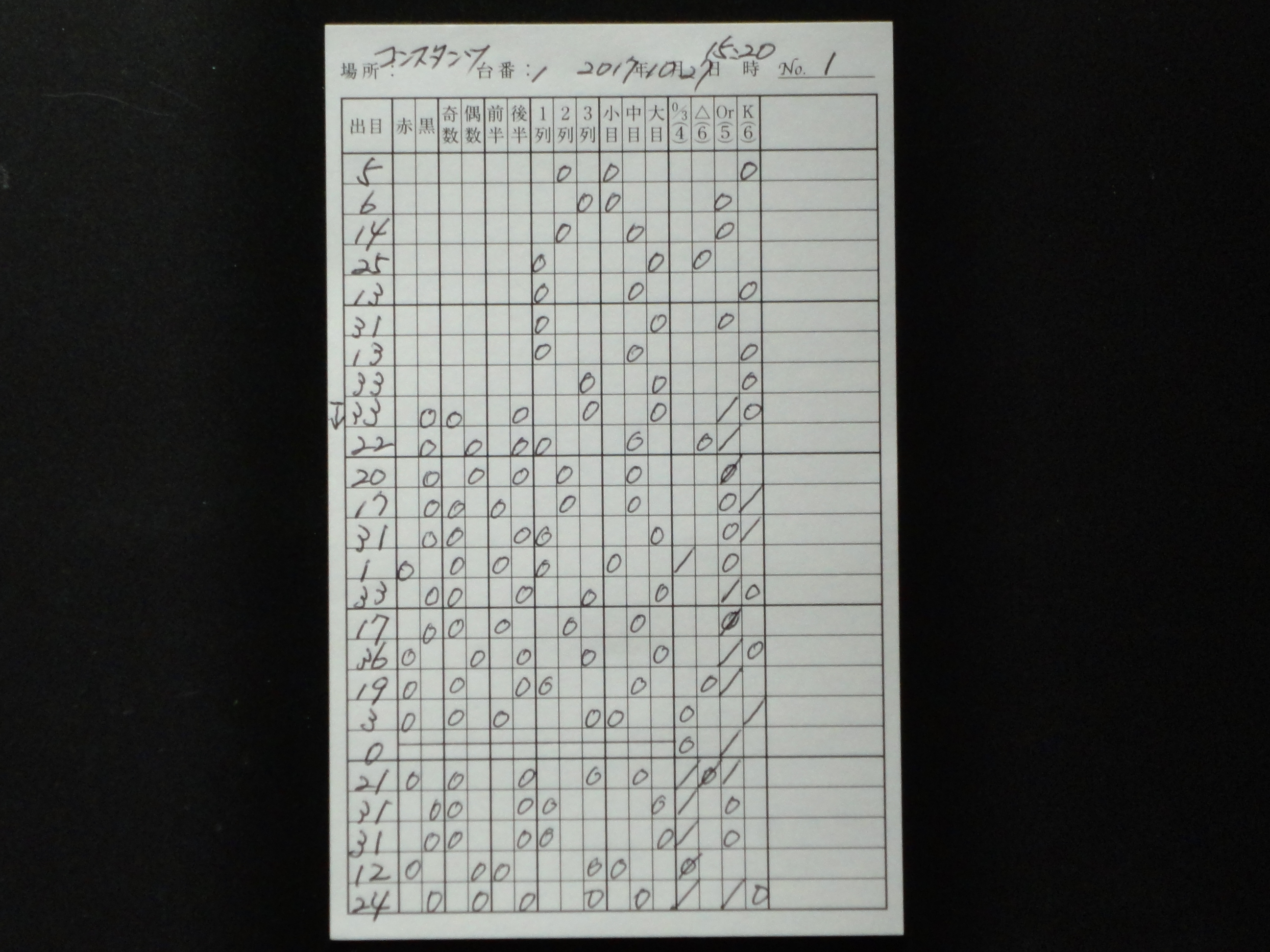 出目表には、ゾーンに賭ける時は当該のゾーンのスペースに斜線を引き(ダブルで賭ける時にはXの形)、実際に出た目の当該のゾーンに○印を記入する。